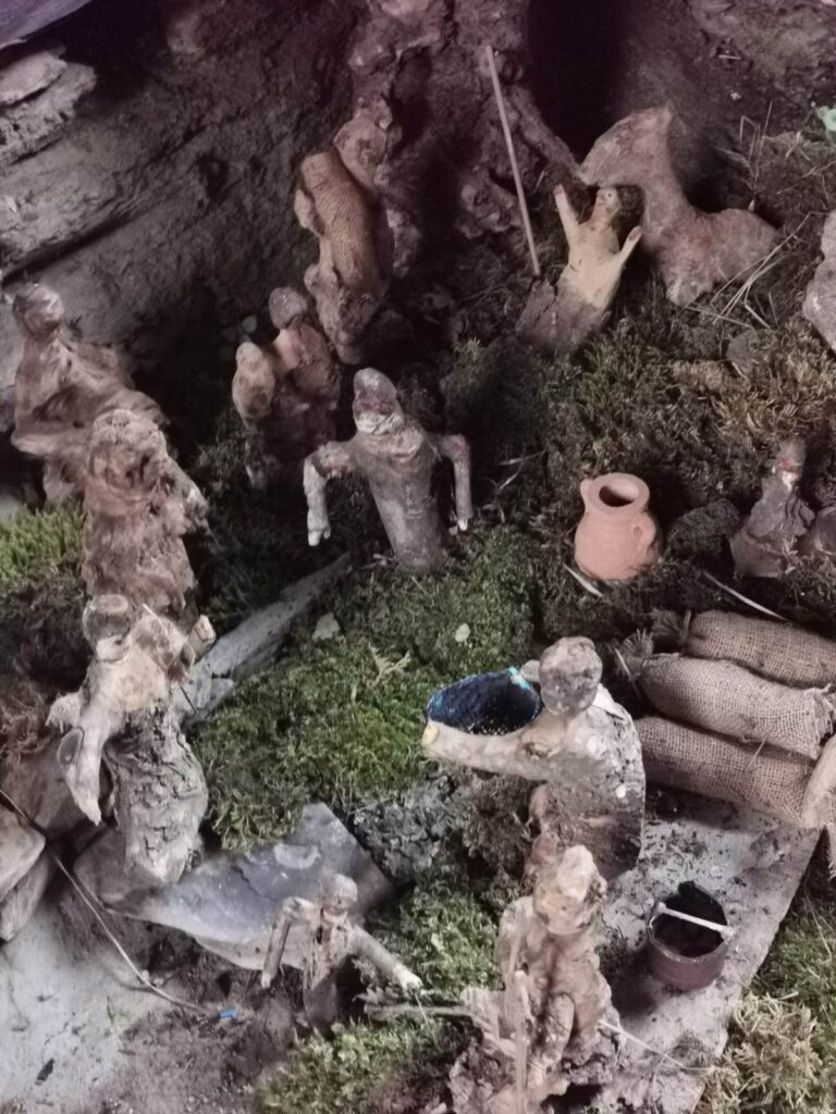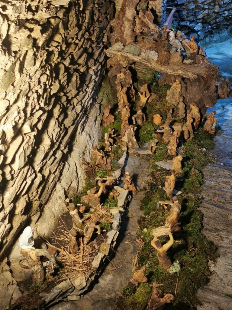 Come ogni anno, da ormai più di 15 anni, Trincheri ha scelto con cura i pezzi di legno e le radici d’ulivo che più gli sembravano adatti e li ha trasformati in statuette che raffigurano gli antichi mestieri, componendo il presepe, visibile da tutti nel borgo.