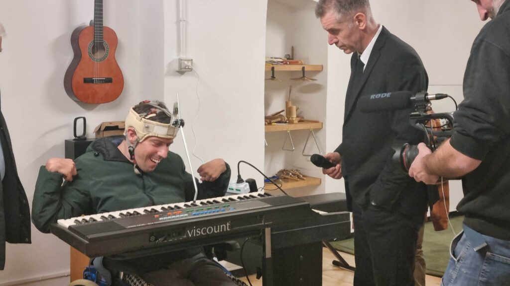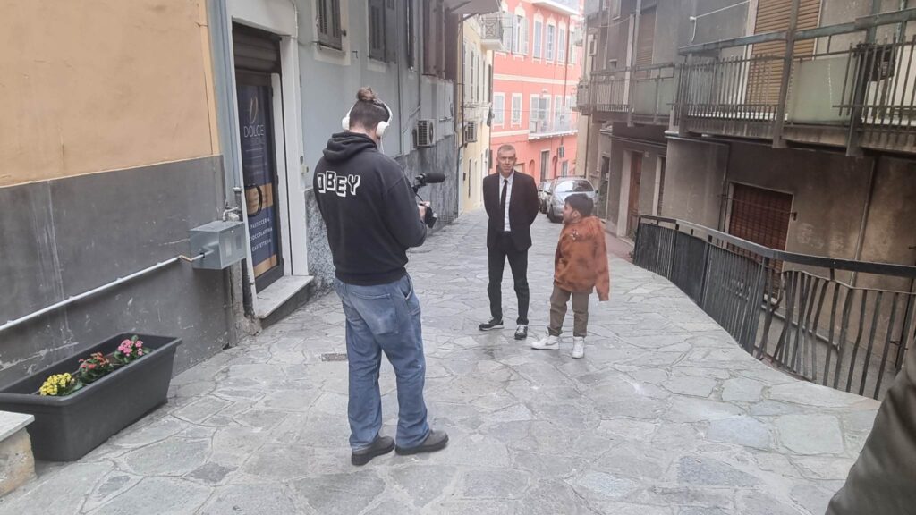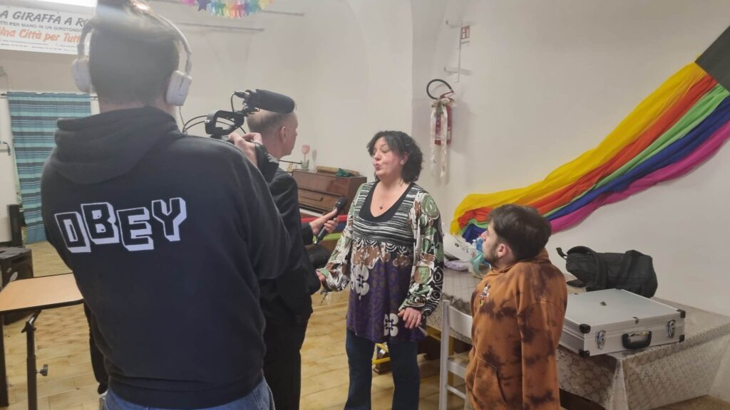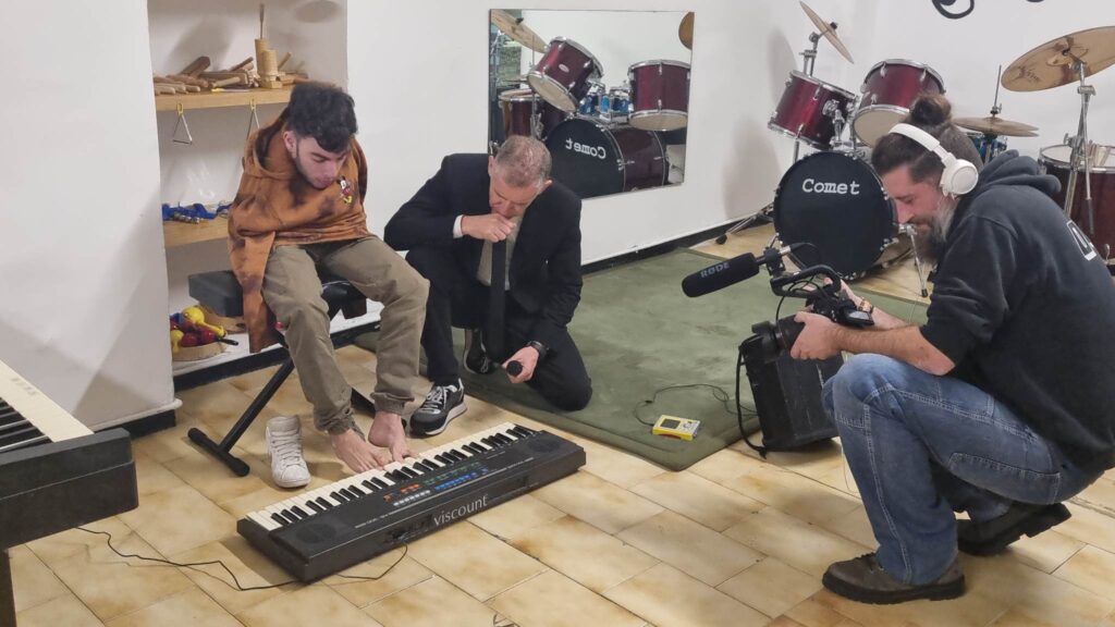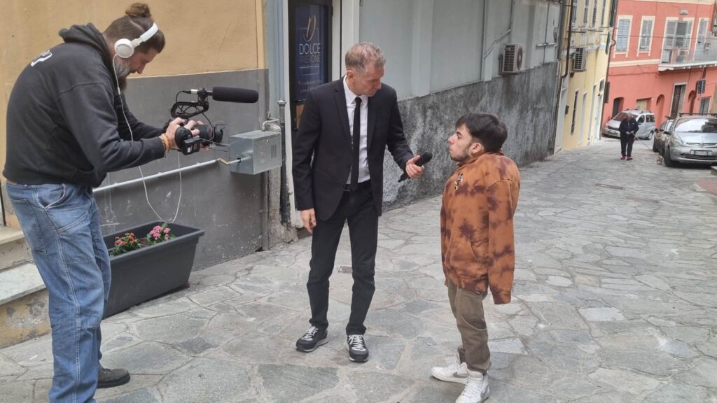 Giornata piena di emozioni oggi alla Tana della Giraffa, la sede dell’associazione La Giraffa a Rotelle in via Caboto, a Imperia. La troupe de “Le Iene”, con il giornalista Andrea Agresti, ha infatti girato alcune scene del servizio che vedrà protagonista Nicholas Deplano, il 21enne di Badalucco, in arte Feet Dj, nato senza gli arti superiori (qui abbiamo raccontato la sua storia), e il nuovo progetto musicale promosso dalla neonata associazione FlyLillo (qui il progetto sui videogiochi inclusivi).