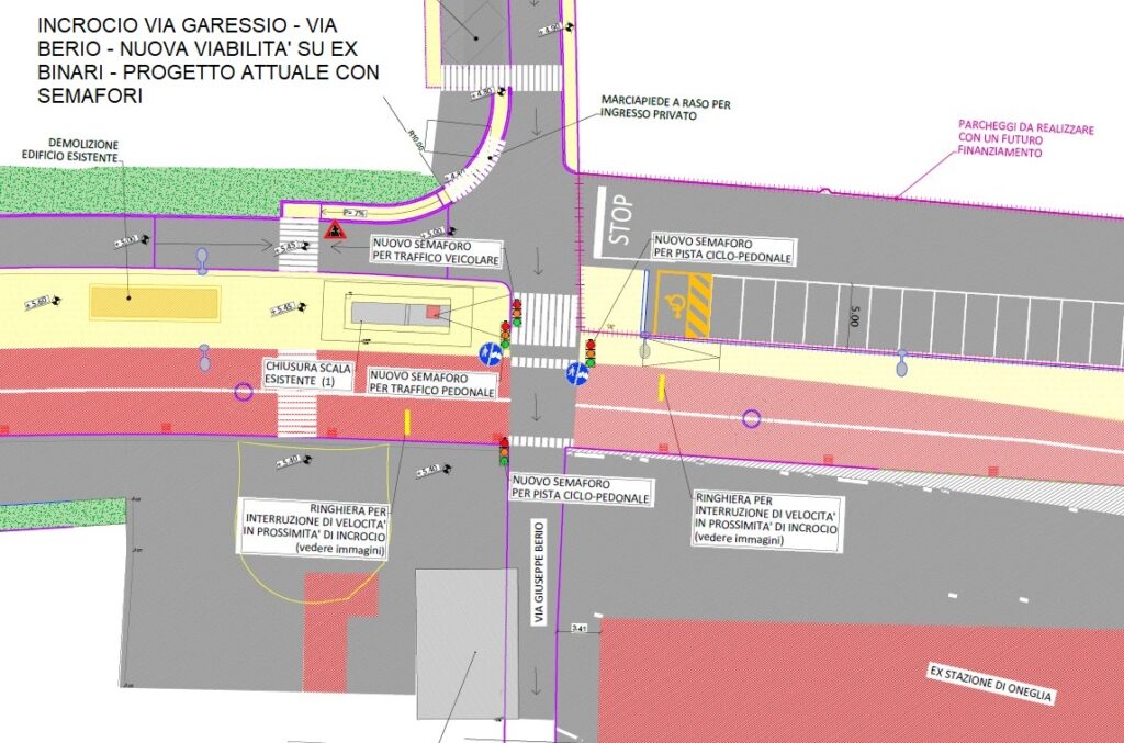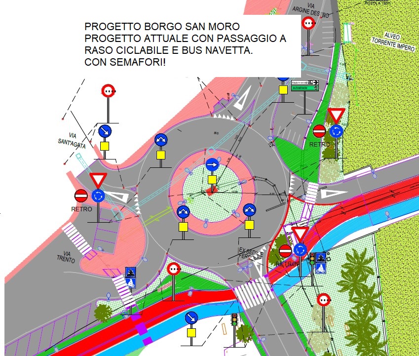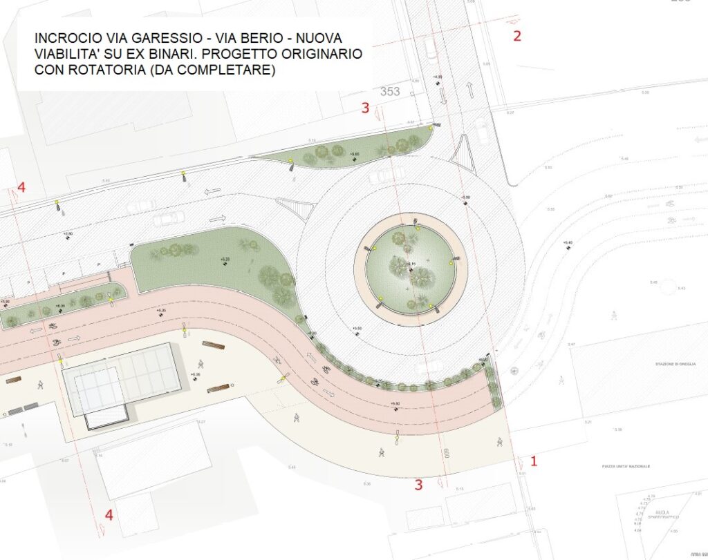 Inoltre “tutto l’asse dalla stazione di Oneglia a Borgo San Moro” ricordano Abbo e Verda “ nel progetto originario era a doppio senso mentre ora è senso unico a causa della corsia dedicata alla navetta”.