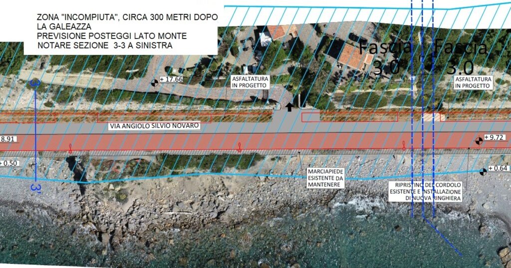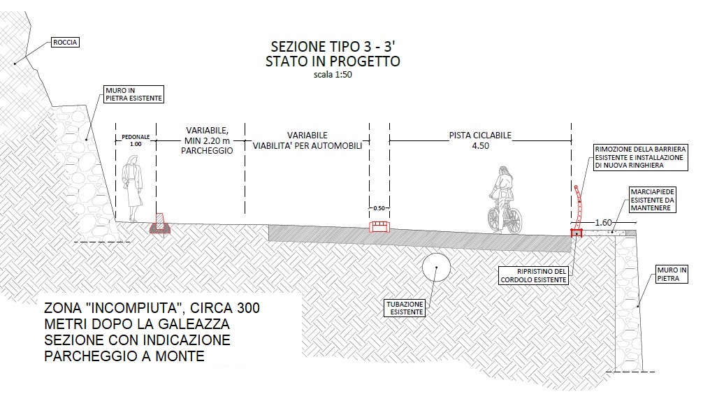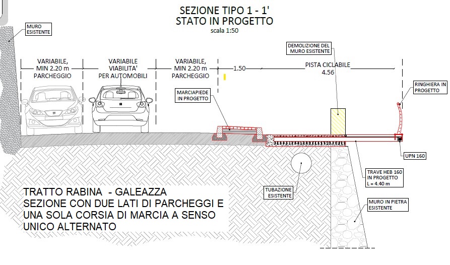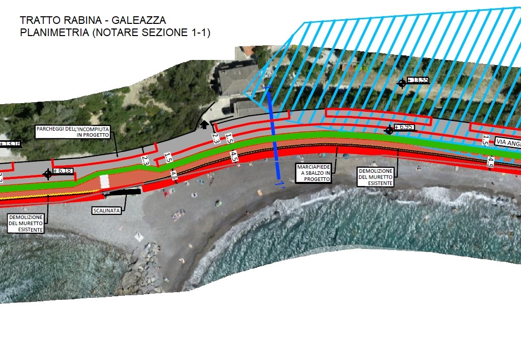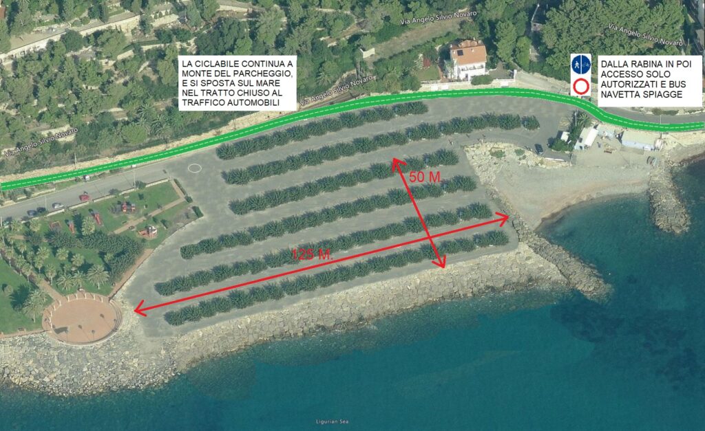 “Per questa zona il progetto esecutivo” proseguono Abbo e Verda ”è di tre tavole con qualche riga abbozzata e senza alcun dettaglio. Si capisce tuttavia che, per non rinunciare a 100 posti auto fra la Rabina e la Galeazza, si prevede una passerella a sbalzo e lo spostamento della ciclopedonale verso mare. I parcheggi, situati a monte e a mare, sarebbero serviti da una sola corsia con senso unico alternato; non si capisce come si pensi di gestire il traffico in questo imbuto, con auto che arriveranno fin quasi al confine di Diano. Rischiamo di rovinare Capo Berta, portando auto e traffico ovunque, in un tratto straordinario e amato da tutti gli imperiesi. Bisogna rinunciare alla passerella a sbalzo e ai parcheggi dopo la Rabina, lasciando solo una corsia di servizio per gli autorizzati. Per sostituire i 100 posti auto mancanti proponiamo una navetta a servizio spiagge e l’ampliamento del parcheggio dalla Rabina che compenserà i parcheggi persi”