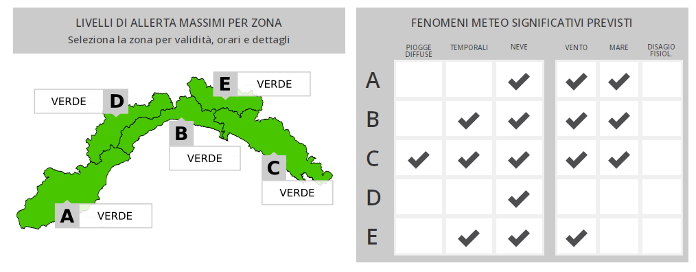 La parte centrale di oggi sarà interessata anche da venti da sud-ovest di burrasca con raffiche fino a burrasca forte su capi esposti e località costiere di A (provincia di Imperia) e su C (80-90 km/h), burrasca su BE (70-80 km/h) con valori >100 km/h sui crinali, 40-50 km/h su D. Tra pomeriggio e sera, piogge sparse e rovesci con bassa probabilità di temporali forti su BCE e cumulate significative su C.