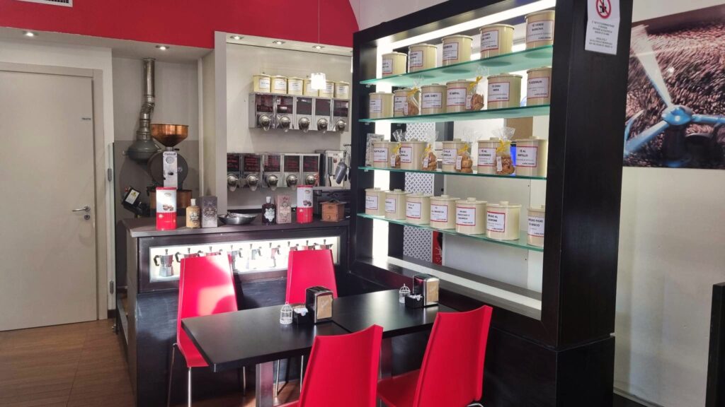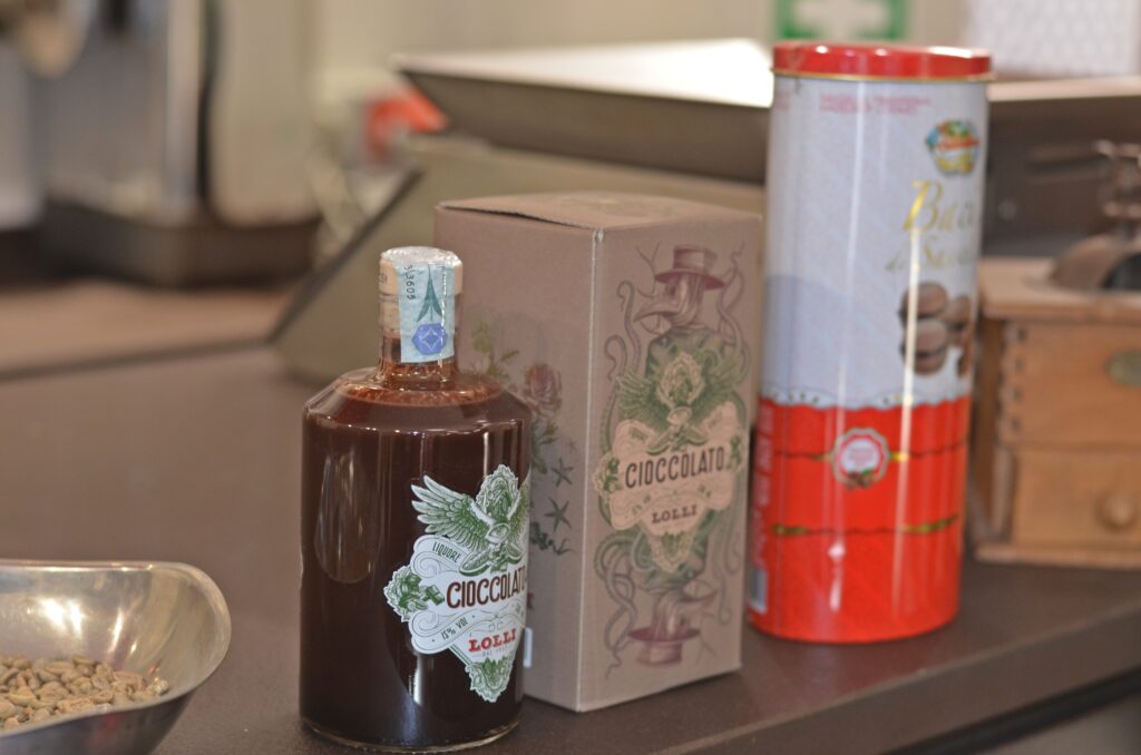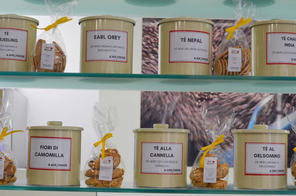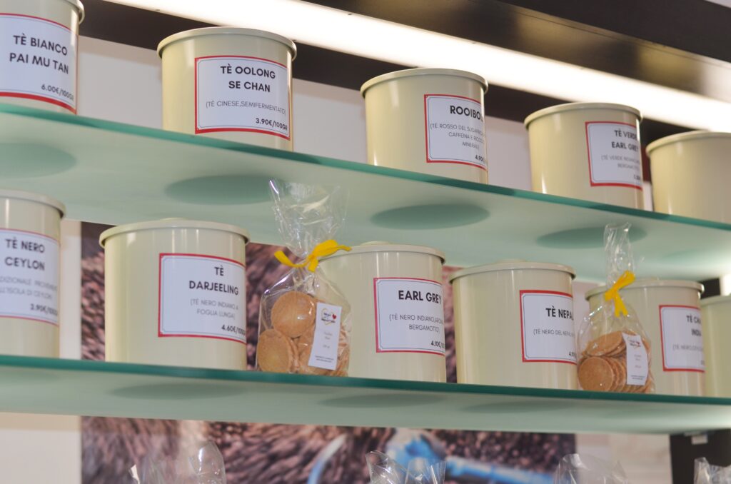 La nostra forza è l‘attenta scelta delle materie prime, concentrandoci sulla qualità e sul gusto. Grazie all’esperienza all’estero ho potuto conoscere e apprezzare tante culture diverse e vorrei portare qui, tramite speciali varietà di caffè e tè, tutto quello che ho scoperto. Abbiamo anche liquori, cioccolatini, biscotti artigianali, amaretti e oggettistica come le teiere. Selezioniamo prodotti delle aziende locali per valorizzare e far conoscere le bontà del nostro territorio.