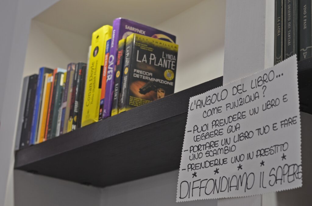 Abbiamo creato anche un angolo per lo scambio di libri. Chi lo desidera può fermarsi qui a leggere quanto vuole o portare un libro a casa o scambiarlo con un altro. Mi piace l’idea di diffondere l’amore per la cultura.