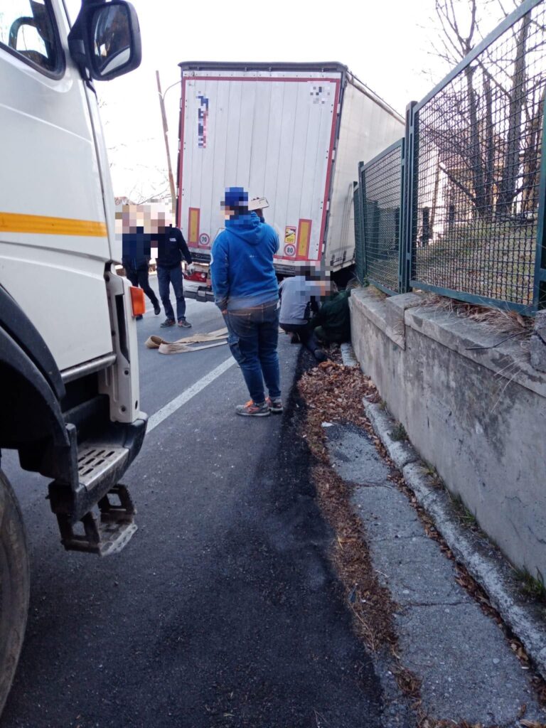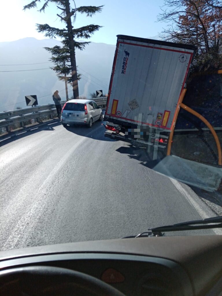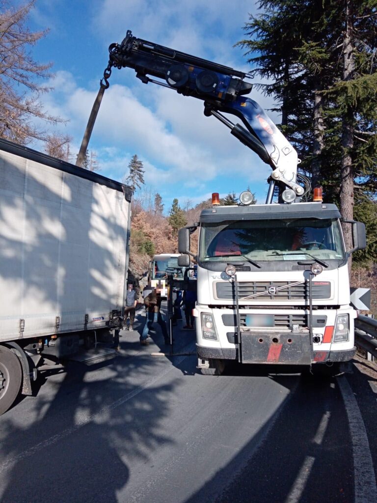 Secondo una prima ricostruzione, il mezzo pesante, nel tentativo di affrontare una stretta curva, sarebbe finito con le ruote posteriori del rimorchio nella cunetta bloccando completamente la strada.