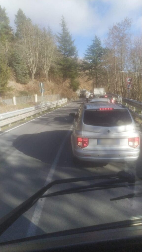 Traffico nuovamente congestionato sulla statale 28 del Col di Nava, nei pressi di Pornassio, per l’ennesimo camion rimasto incastrato in un cunetta.
