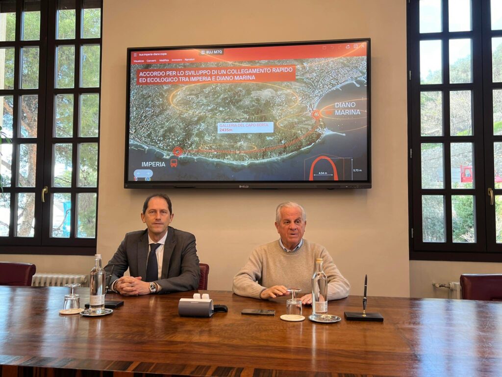 I sindaci di Imperia e Diano Marina, Claudio Scajola e Cristiano Za Garibaldi, hanno firmato questa mattina nel Palazzo Civico del Capoluogo l’accordo per lo sviluppo e la realizzazione di un progetto di collegamento rapido, con un trasporto pubblico locale ecologico, tra i due comuni attraverso la dismessa galleria ferroviaria del Capo Berta.