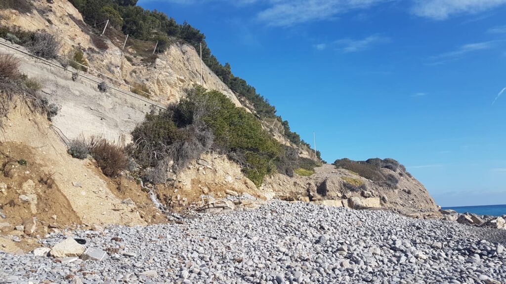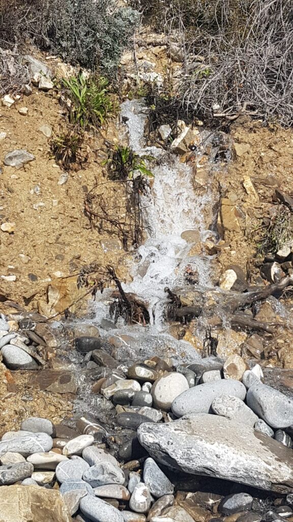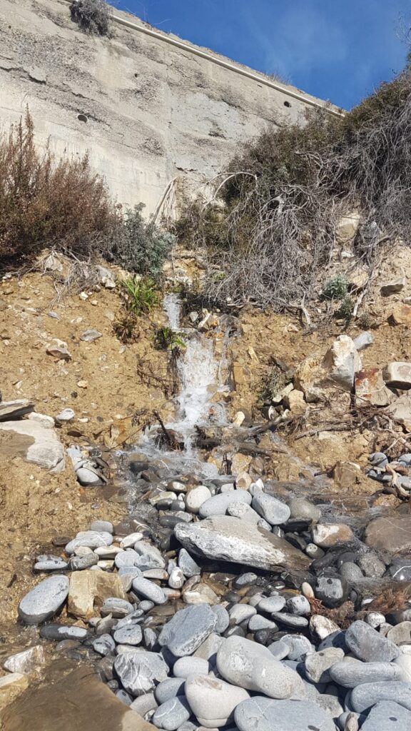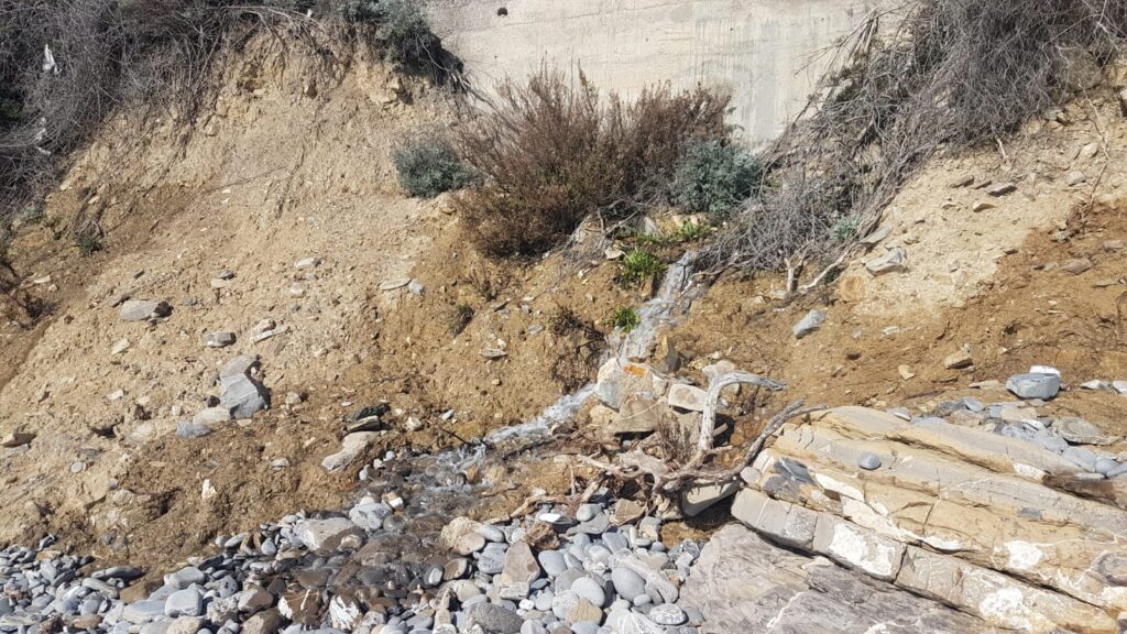 Come si evince dai video e dalle immagini una vera e propria cascata d’acqua sgorga sulla spiaggia fuoriuscendo dal versante al di sotto dell’Incompiuta, circa a metà percorso.