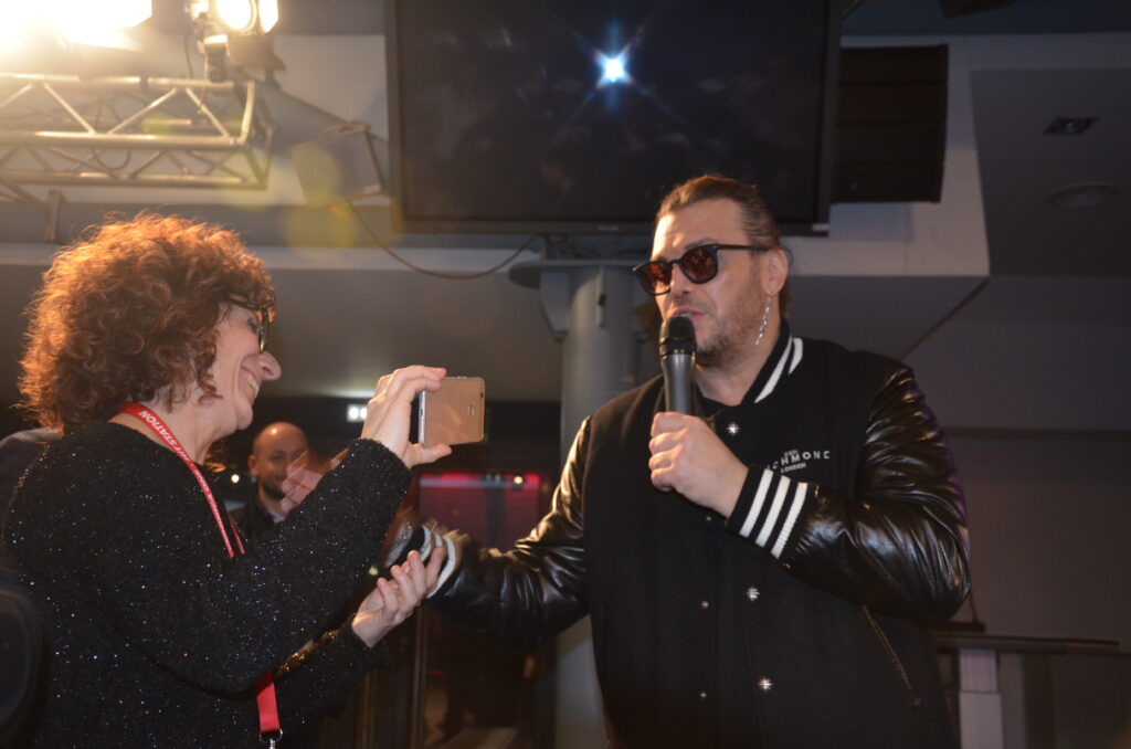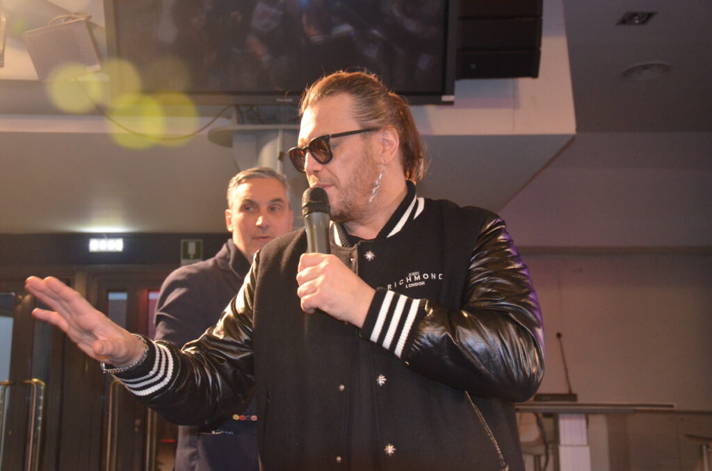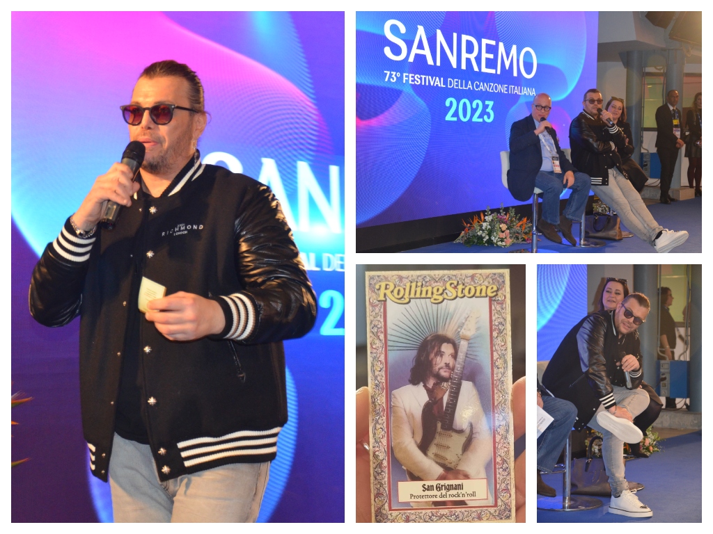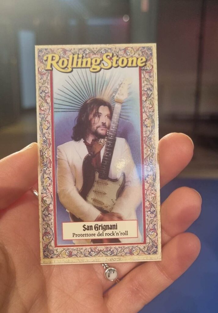 Gianluca Grignani ha consegnato ai giornalisti presenti un “santino” riportante la sua immagine corredata dalla scritta “San Grignani, protettore del Rock’n’roll”.