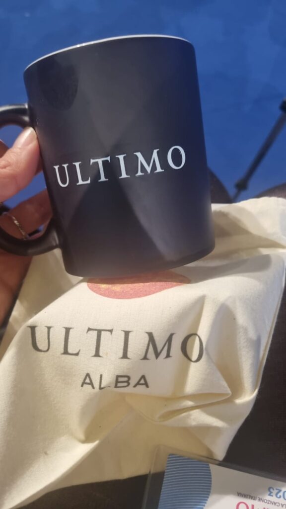 Ultimo ha portato un gadget per tutti i giornalisti in sala: una tazza riportante il suo nome e il titolo della sua canzone ‘Alba’.