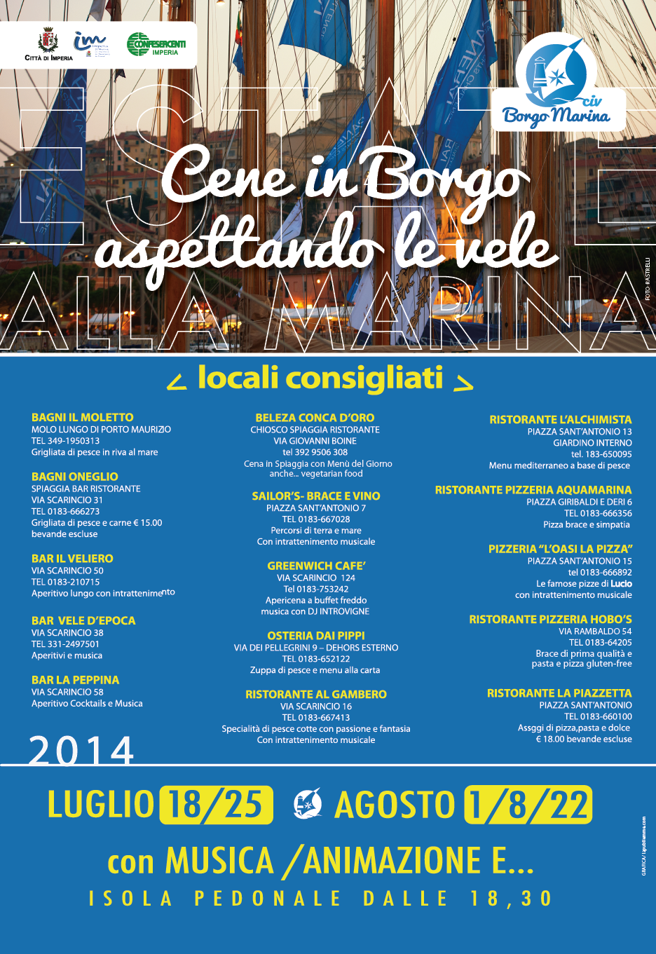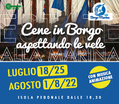 IMPERIA – Tornano le “Cene in Borgo” alla Marina di Porto Maurizio. Le serate organizzate dal Civ di Borgo Marina proseguiranno il prossimo venerdì 22 agosto.