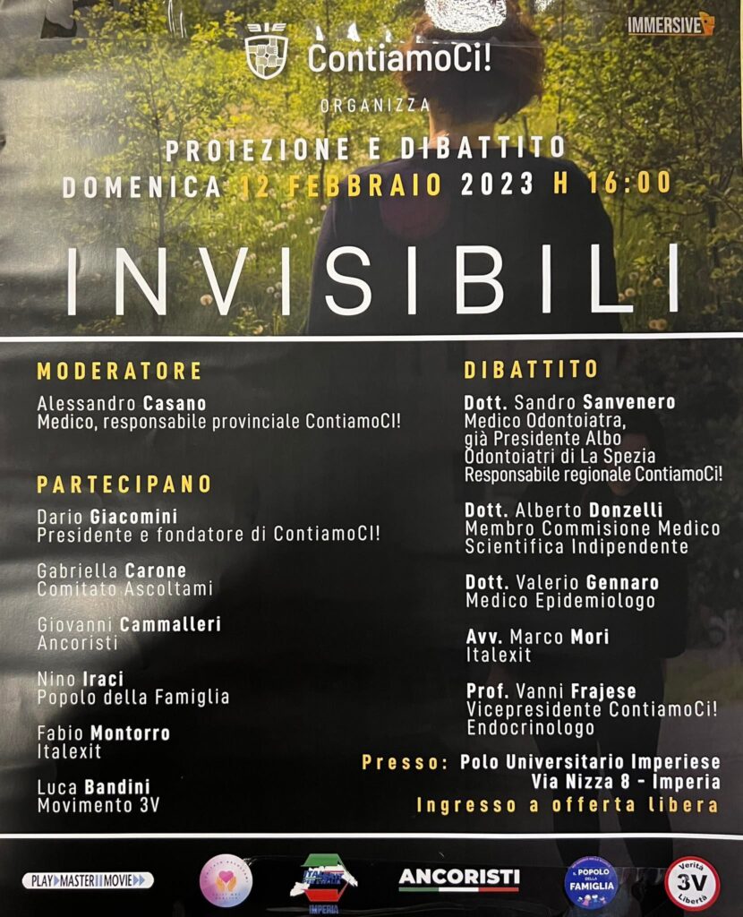 L’Aula Magna del Polo universitario di Imperia ha ospitato oggi pomeriggio la proiezione del docufilm “Invisibili”, che raccoglie numerose testimonianze documentate di persone che hanno subito reazioni avverse anche pesanti a seguito delle vaccinazioni anti Covid.