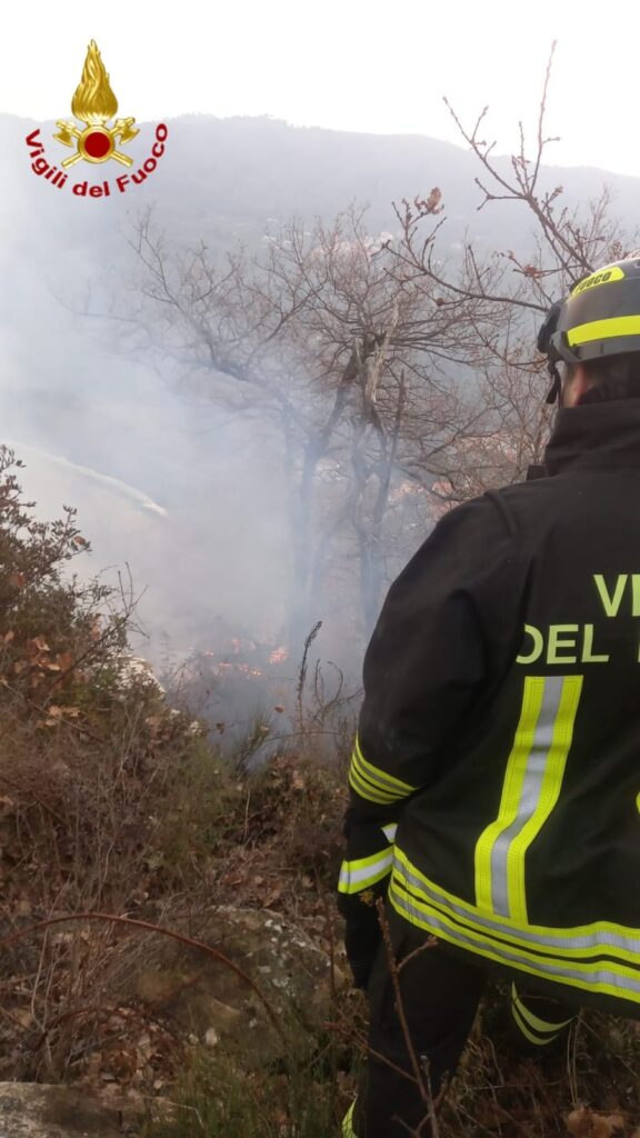 Intervento dei Vigili del Fuoco nel tardo pomeriggio di oggi, lunedì 13 febbraio, a Pietrabruna per un incendio boschivo. Il rogo sta interessando la zona boschiva, ai piedi del Monte Follia.