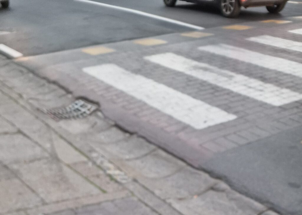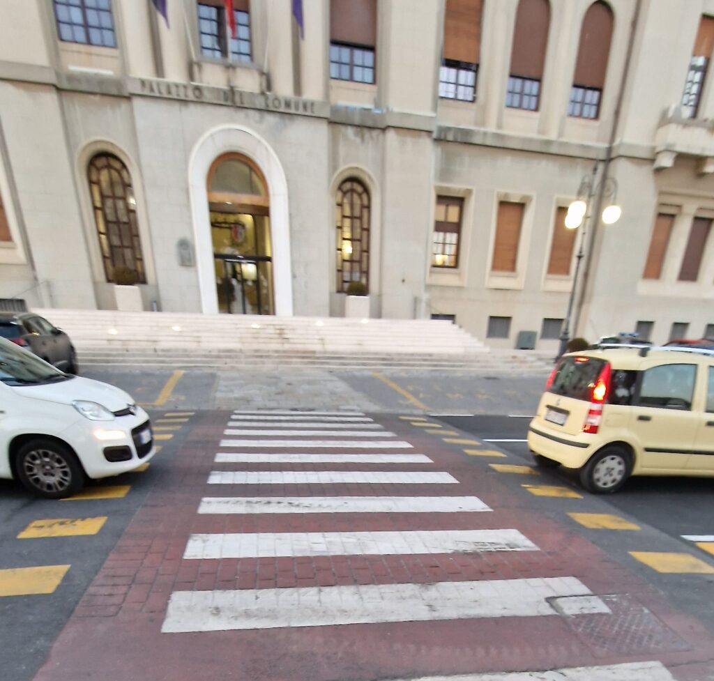 “A fine luglio 2019 è stata inaugurata la nuova scala accessibile del Palazzo Comunale di Imperia. In quell’occasione ci siamo accorti che le strisce pedonali davanti al Comune non sono accessibili poiché presentano un grosso avvallamento (per far defluire la pioggia) che le rende impraticabili e pericolose per chi ha problemi motori, ipovedenti, anziani.