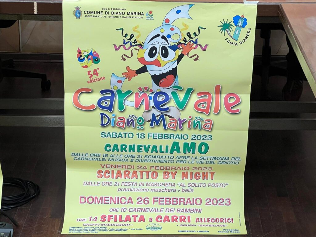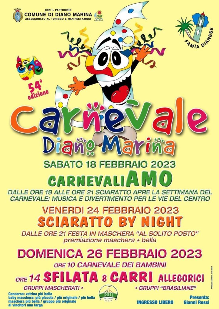 Per la prima volta nella storia il carnevale a Diano Marina durerà una settimana intera. La città inizierà infatti a festeggiare il carnevale già Sabato 18 febbraio, alle ore 18, quando nelle vie del centro città sfilerà un carro allegorico con la mascotte Sciaratto (realizzata e ideata da Manuela Cerato) che verrà attorniato da gruppi musicali e tanta allegria.