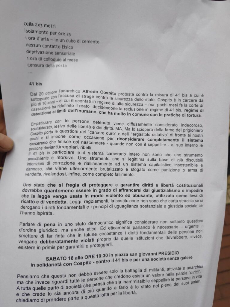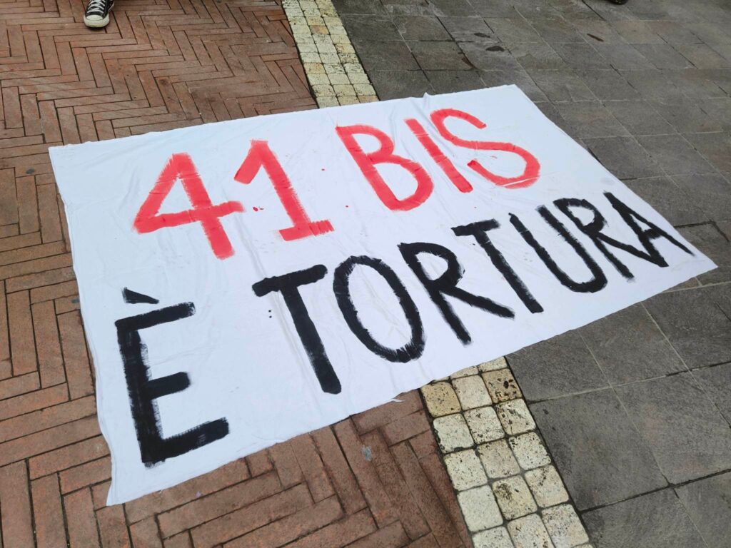 Siamo qui anche per il 41 bis in generale perché la riteniamo una misura detentiva medievale, completamente priva di ogni logica di diritto umanitario. Siamo qui anche per ricordare, con un volantino prodotto da Zero Calcare e uno prodotto da noi, le condizioni tremende in cui versano le carceri italiane.