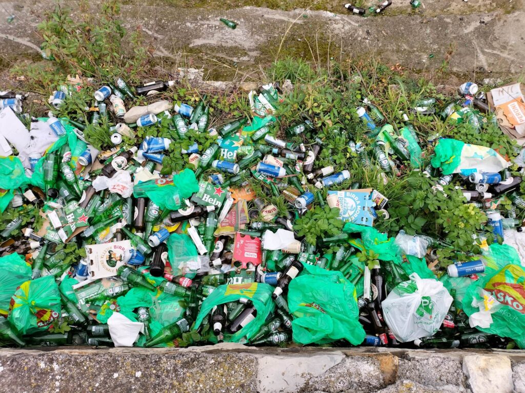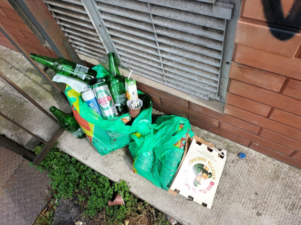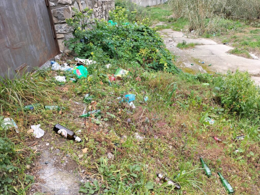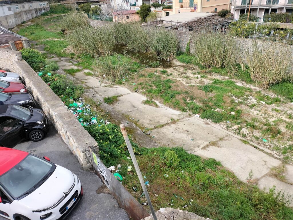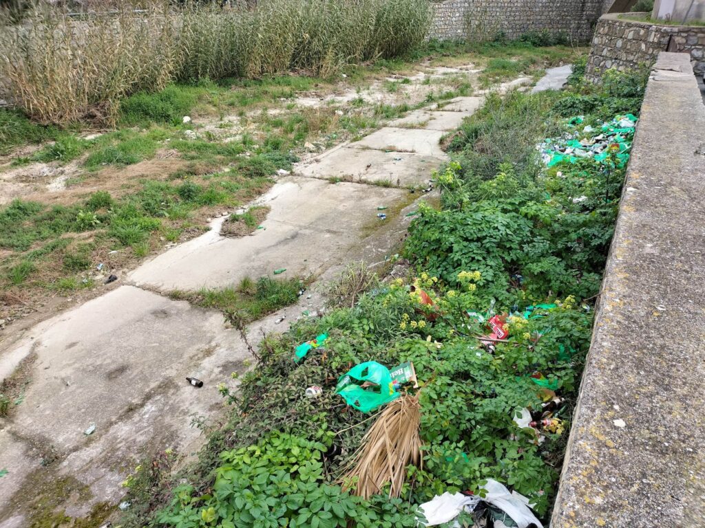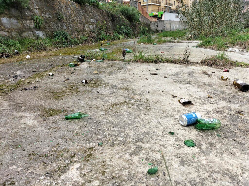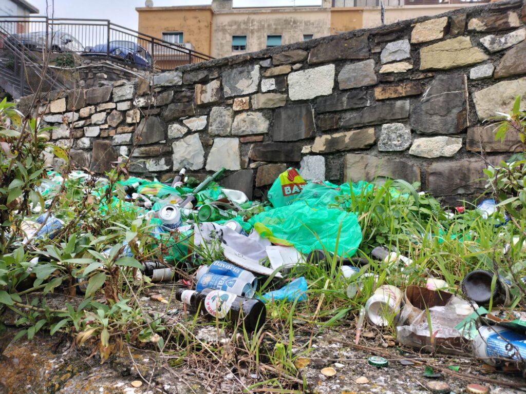 Nel letto del torrente e nel terrapieno soprastante insistono sacchetti di platica, lattine e bottiglie di birra in grande quantità.