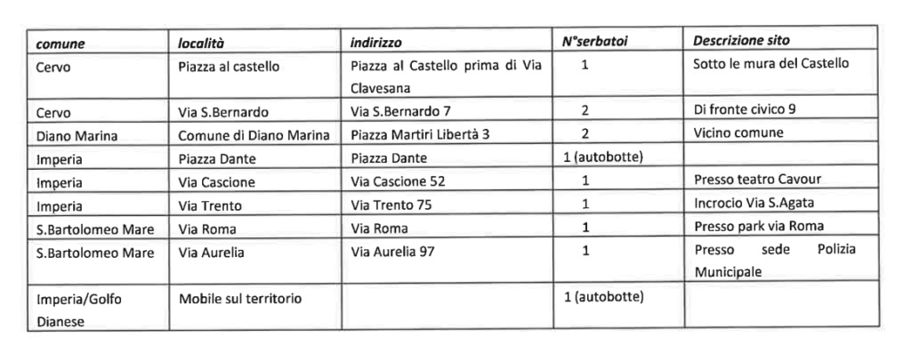 Inoltre un’autobotte si sposterà sul territorio fra Imperia e il Golfo Dianese.