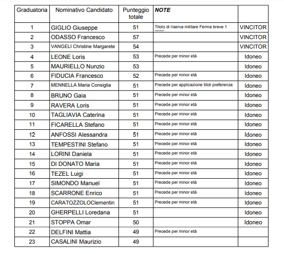 Il concorso, indetto dal Comune di Imperia nel novembre scorso, con scadenza 6 dicembre 2022, prevedeva l’assunzione di tre messi comunali, a tempo pieno e indeterminato (qui il bando). Ottantasei i candidati che hanno sostenuto le prove scritte e orali, tenutesi lunedì 19 e giovedì 22 dicembre al Polo Universitario Imperiese, 21 quelli risultati idonei.