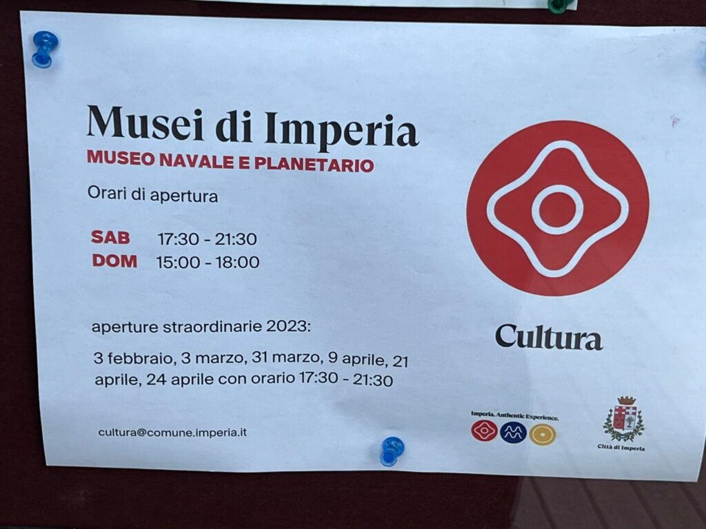 Il Museo Navale è l’unico Museo della città di Imperia, non ci sono altri musei. Siamo arrivati e ci troviamo il cartello che è aperto solo il sabato e la domenica.