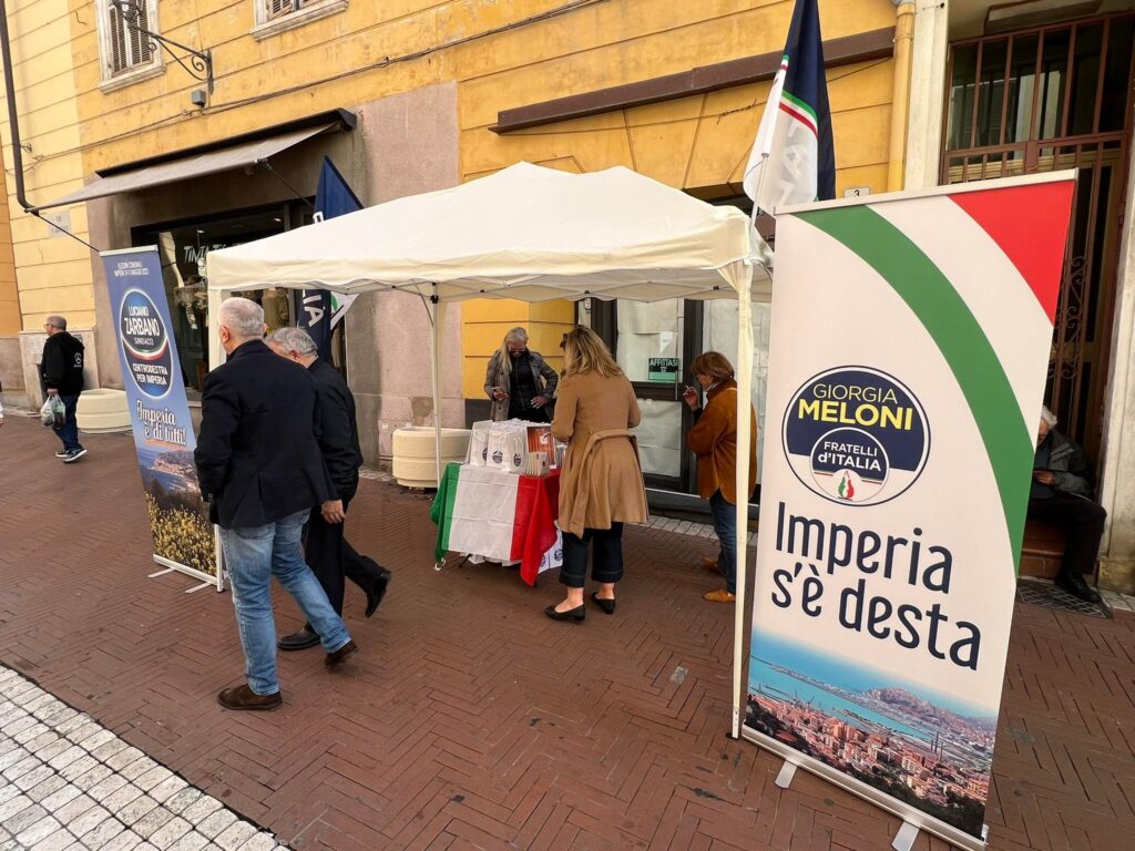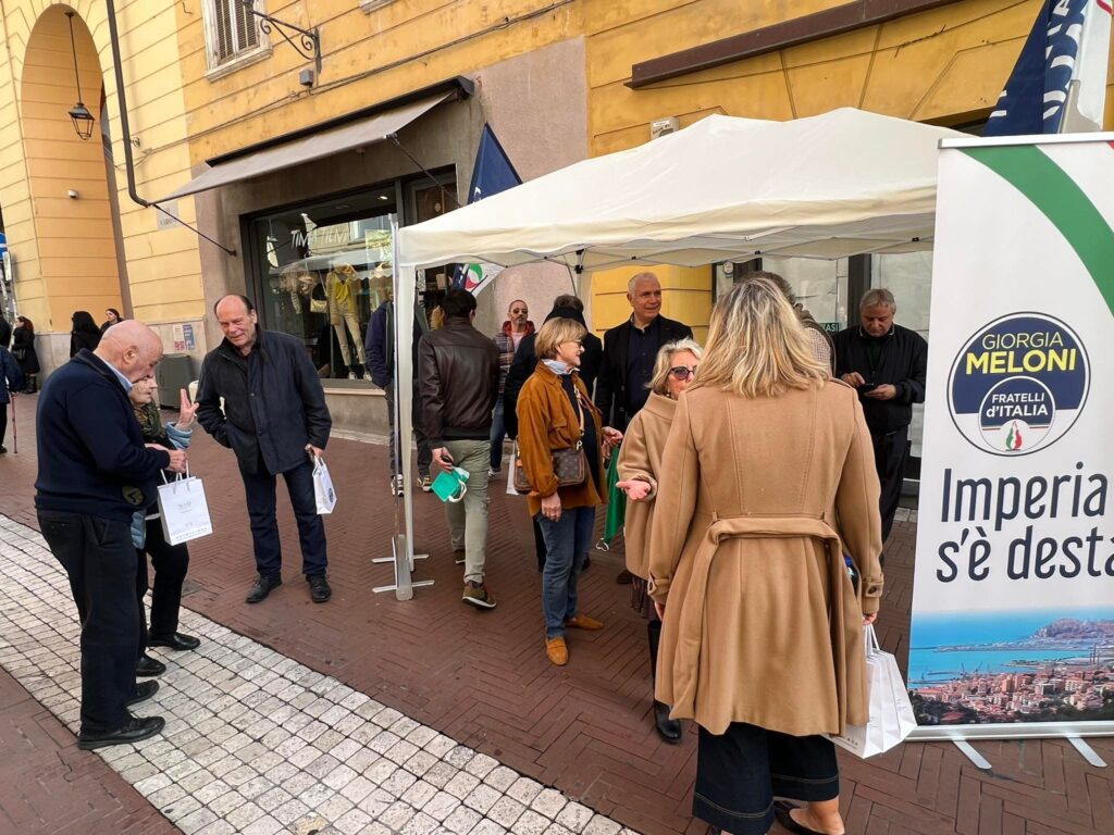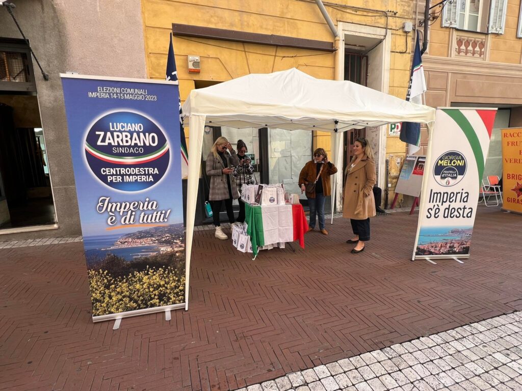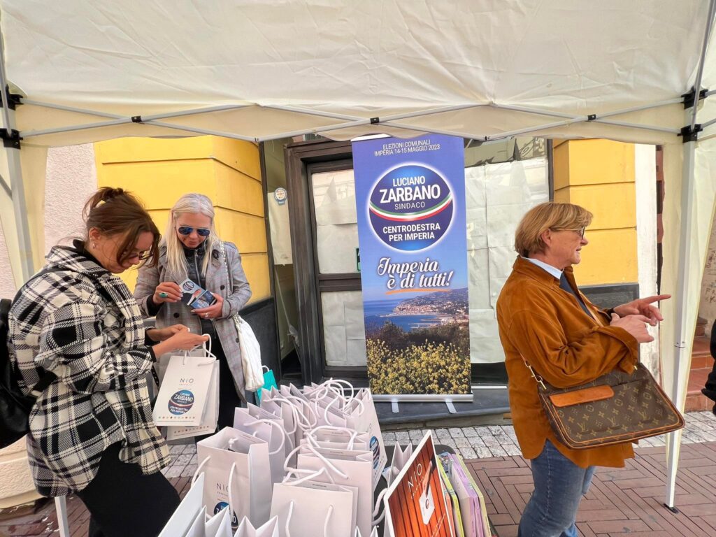 Gazebo in via San Giovanni con distribuzione di cocktail questa mattina a Imperia per il candidato sindaco di Fratelli d’Italia Luciano Zarbano.