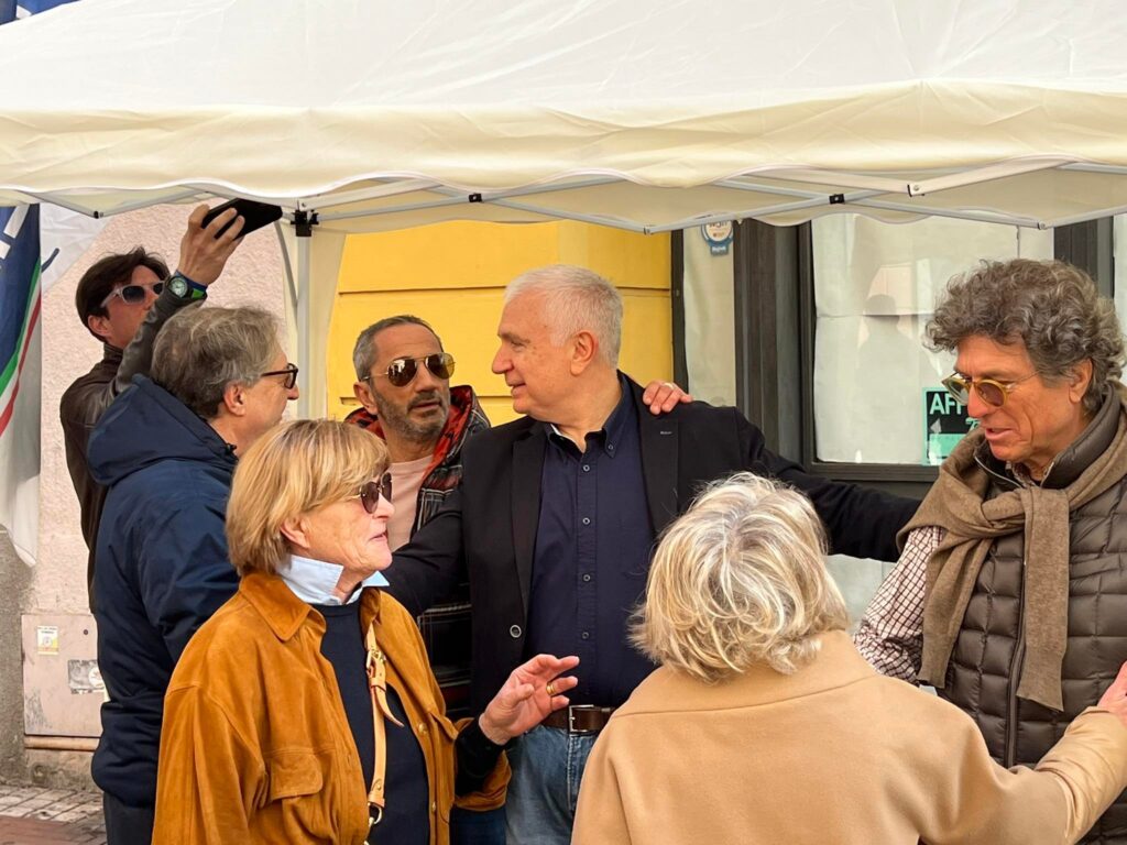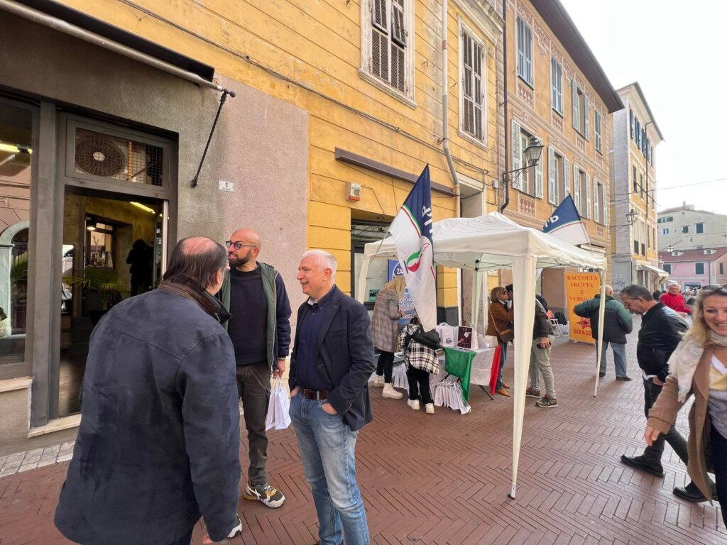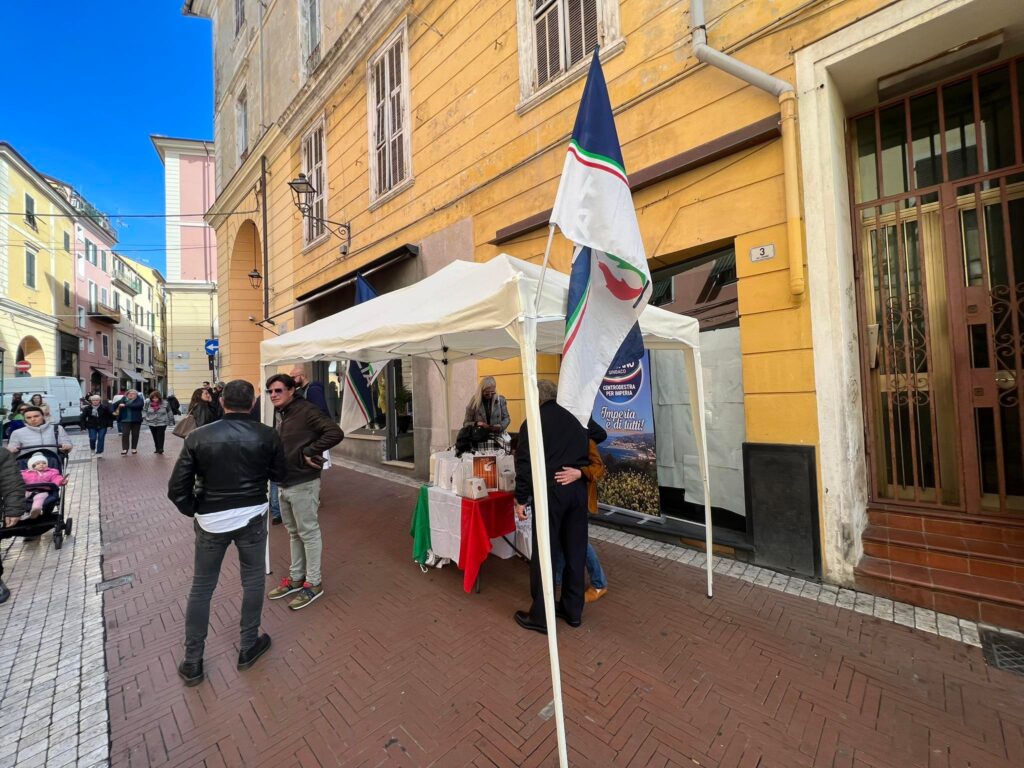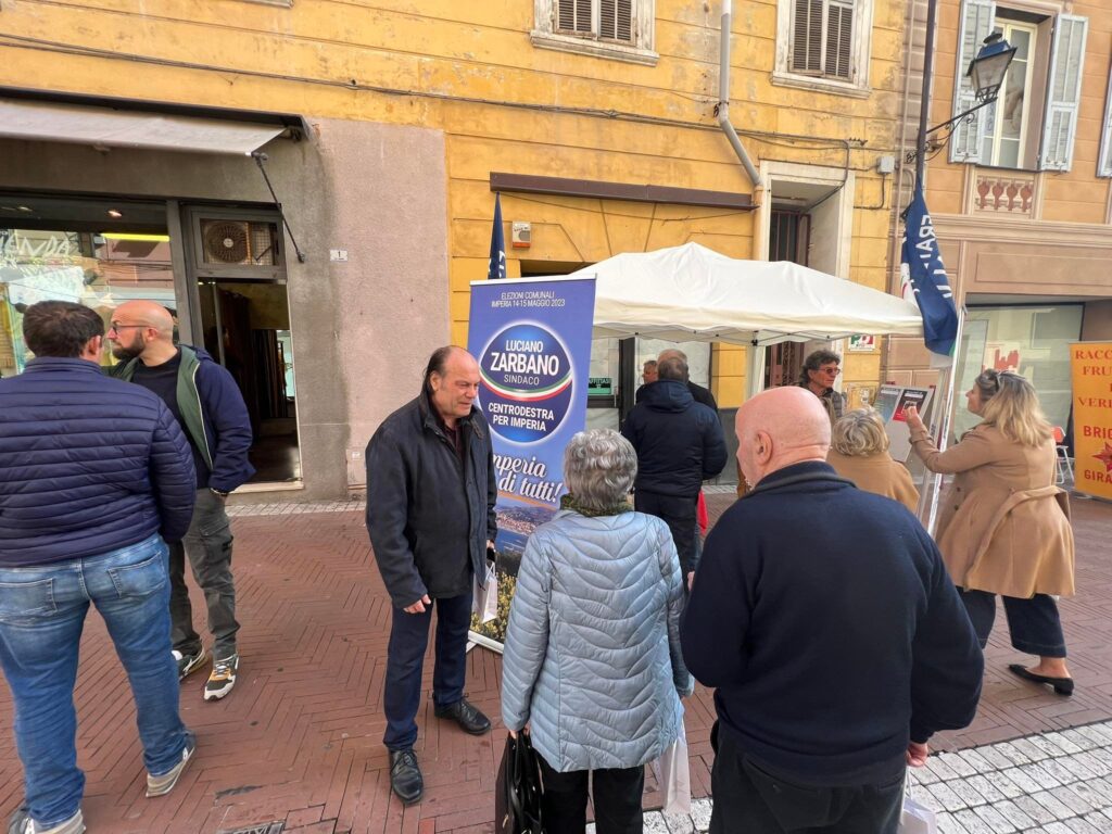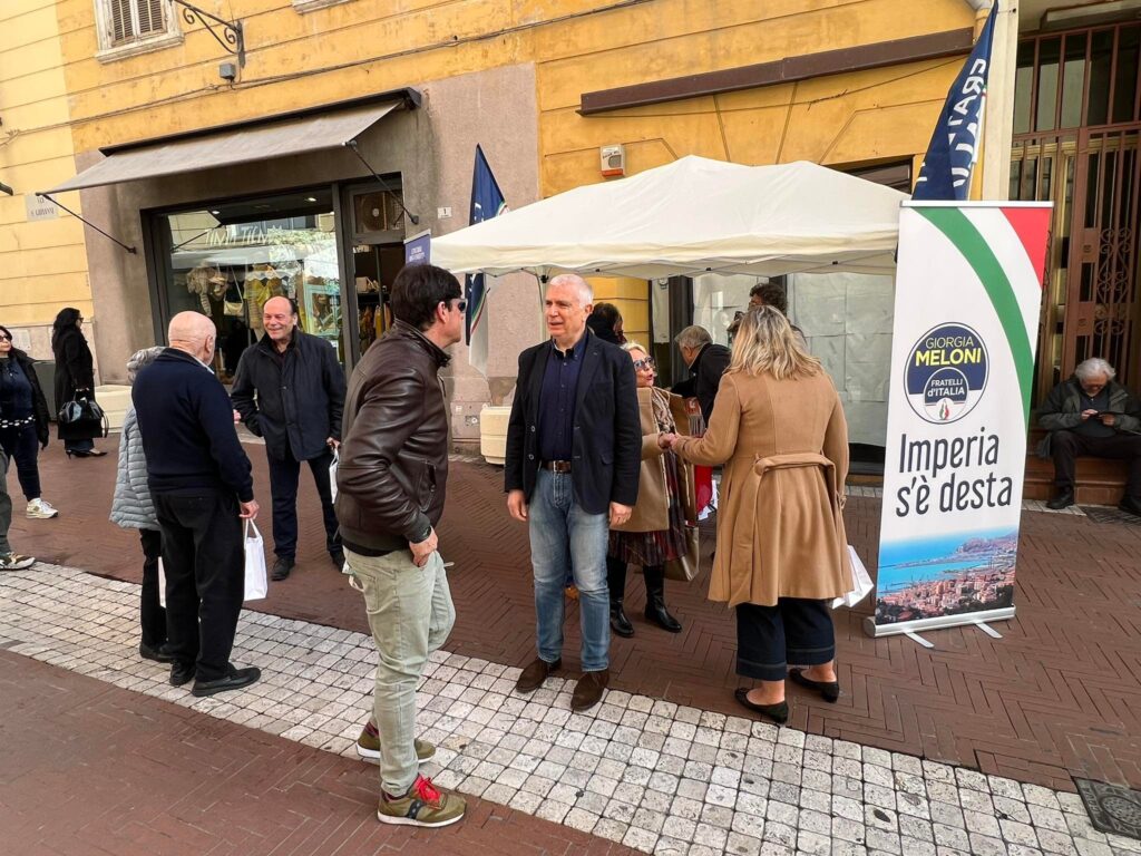 Gazebo in via San Giovanni con distribuzione di cocktail questa mattina a Imperia per il candidato sindaco di Fratelli d’Italia Luciano Zarbano.