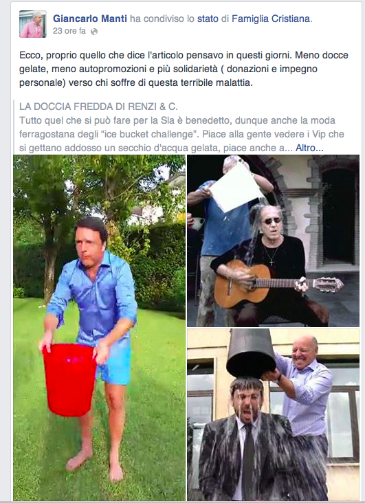 Una posizione condivisa anche dal consigliere regionale Giancarlo Manti che ha commentato: “Meno docce gelate, meno autopromozioni e più solidarietà ( donazioni e impegno personale) verso chi soffre di questa terribile malattia”.