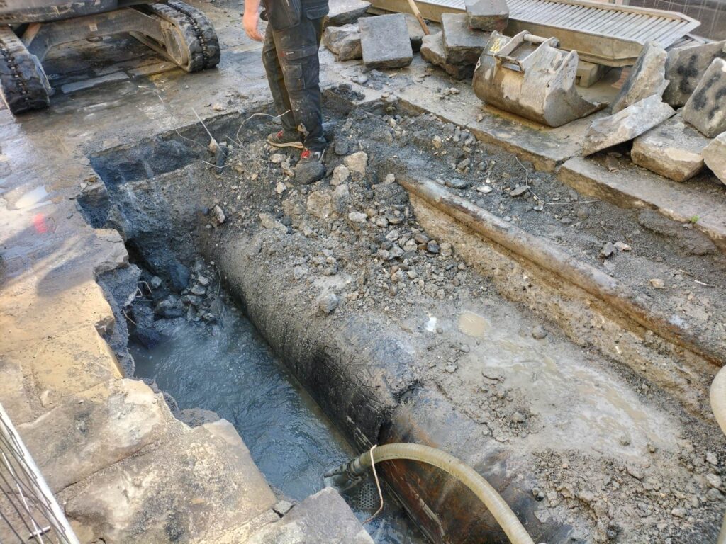 Operai al lavoro questa mattina in Calata Cuneo a Imperia, per un guasto all’acquedotto del Roja. Sul posto sono presenti i tecnici della Rivieracqua.