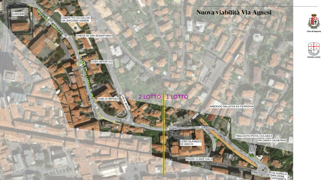 Tale tracciato sarà integrato alla pista ciclabile in corso di esecuzione. L’area di intervento si estende da nord-ovest a sud-est “circondando” per intero il centro storico di Oneglia, oggi diviso in due dal tracciato di via Bonfante e via Amendola.