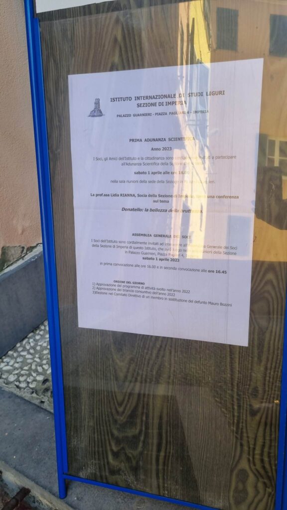 Si è svolta sabato 1 aprile, presso Palazzo Guarnieri, la conferenza tenuta dalla professoressa Lidia Rianna, socia della Sezione di Imperia dell’IISL, docente di Storia dell’Arte presso il Liceo Scientifico “G.P.Vieusseux” di Imperia, sul tema “Donatello: la bellezza della bruttezza”.