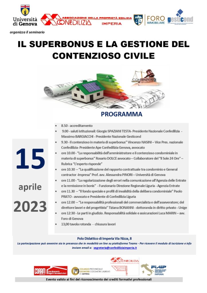 “Superbonus 110% e gestione del contenzioso”: questo il tema del seminario di apertura del corso di aggiornamento per amministratori di condominio che si terrà in presenza ed in contemporanea in remoto tramite collegamento con la piattaforma teams presso il Polo universitario di Imperia, Aula Magna, in via Nizza.