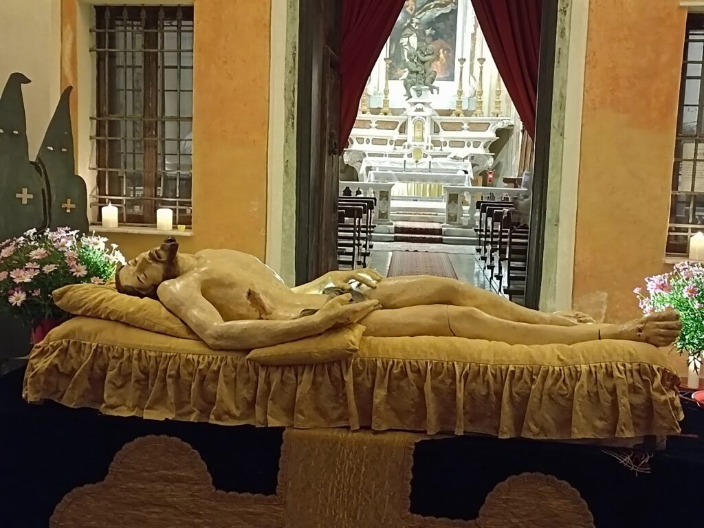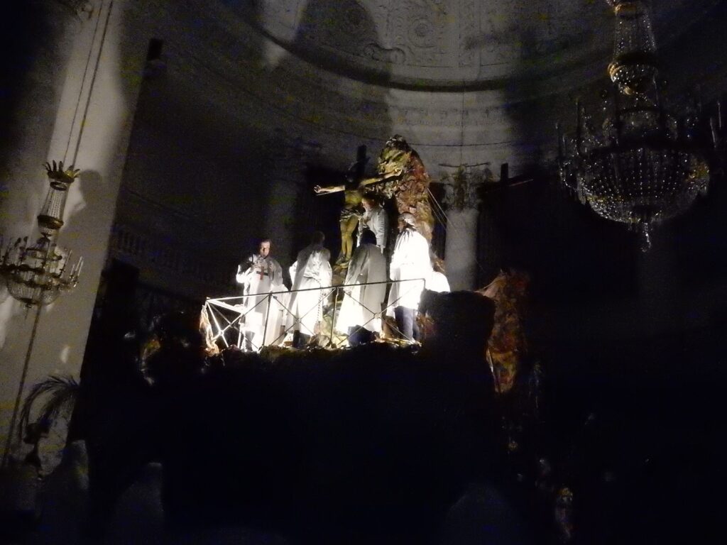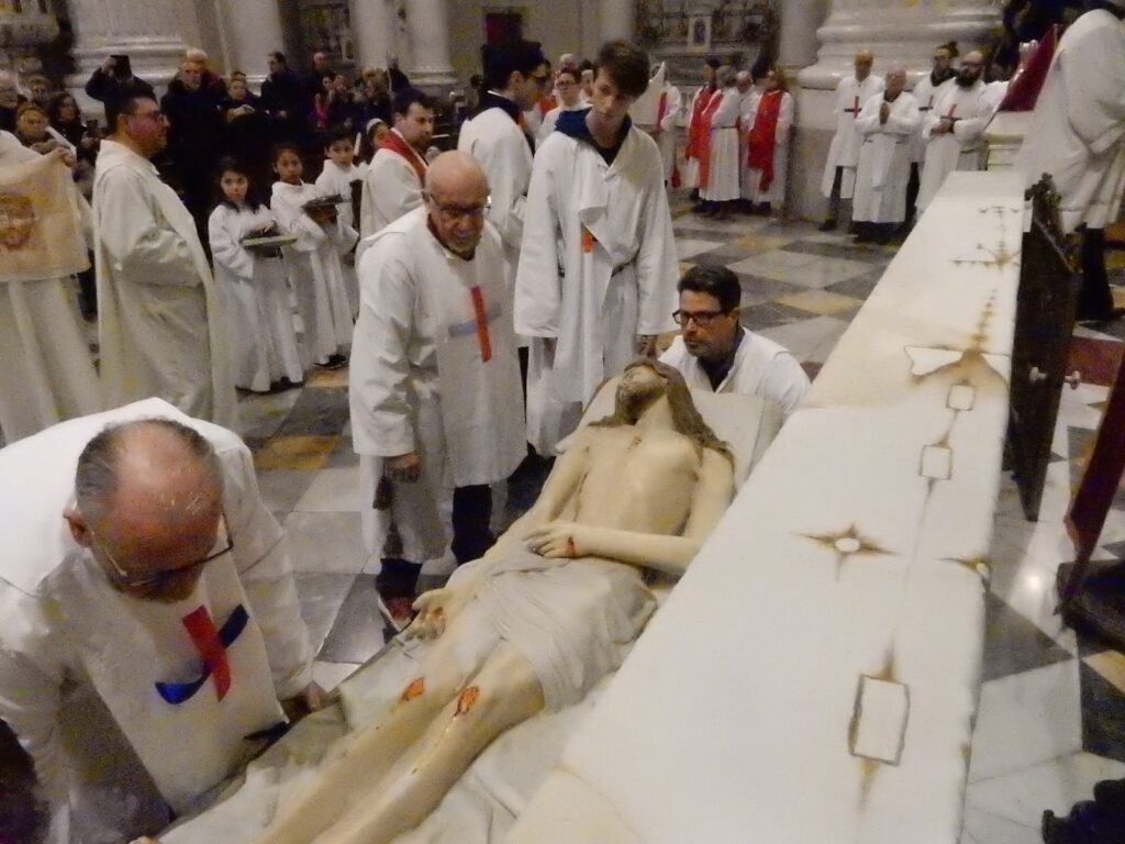 Si tratta di una cerimonia molto toccante che raggiunge il suo culmine, quando, nel silenzio della basilica, riecheggiano i colpi del martello mentre vengono tolti i chiodi dal corpo di Cristo. La cerimonia prosegue con una processione in cui vengono portati i segni della Passione ed un Cristo morto di gesso, adagiato su un lettino e coperto da un baldacchino nero.