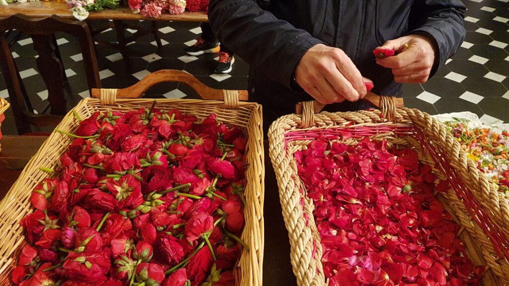 Il “Sepolcro” viene preparato con il concorso di molti: gli anziani hanno scelto i petali per colori, i confratelli di san Martino hanno allestito le strutture e preparato il tappeto fiorito per l’infiorata che si potrà visitare sino alle ore 12 sabato mattina.