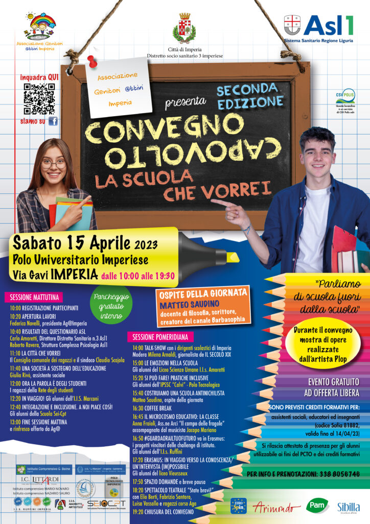 L’Associazione Genitori @ttivi Imperia è orgogliosa di invitare la cittadinanza alla seconda edizione del convegno capovolto: “la scuola che vorrei“, che avrà luogo il giorno 15 aprile, dalle ore 10:00 alle 19:20, presso il Polo Universitario Imperiese, col patrocinio del Comune di Imperia, Asl 1 e distretto socio sanitario 3 imperiese.