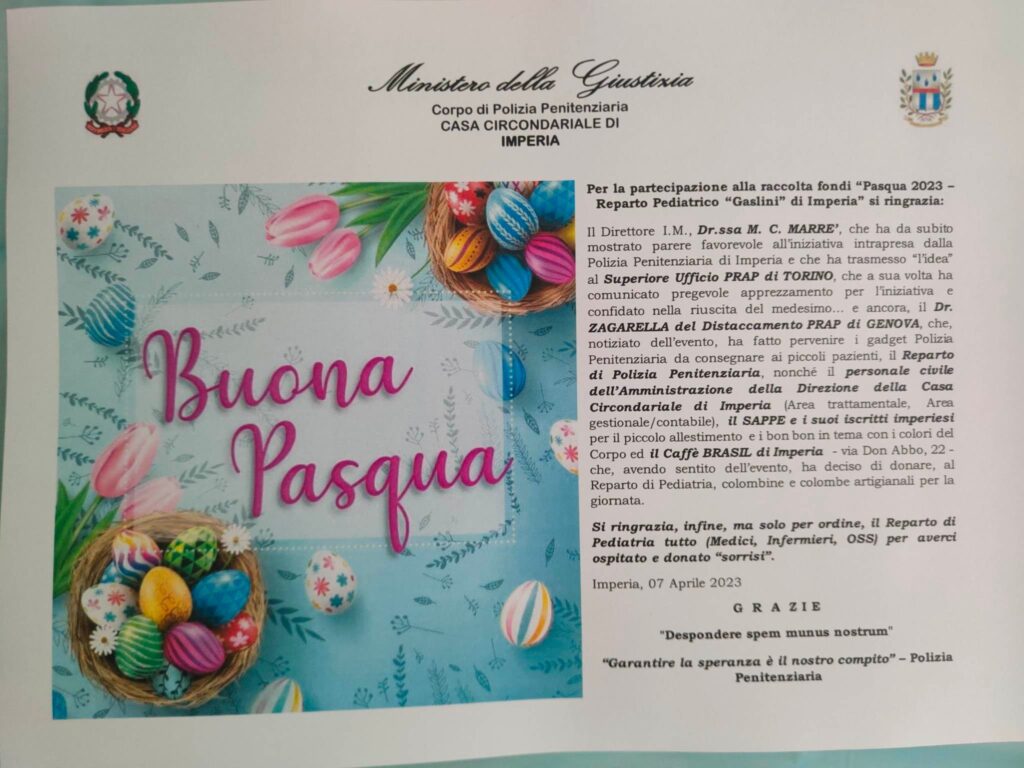 L’iniziativa è stata realizzata grazie a una raccolta fondi fra il personale della Polizia Penitenziaria, alla quale hanno collaborato il Direttore Dr.ssa Marrè, che ha da subito mostrato parere favorevole all’iniziativa intrapresa dalla Polizia Penitenziaria di Imperia e che ha trasmesso l’idea al Superiore Ufficio PRAP di Torino, che a sua volta ha comunicato l’apprezzamento per l’iniziativa e ancora, il Dr. Zagarela del Distaccamento PRAP di Genova, che ha fatto pervenire i gadget Polizia Penitenziaria da consegnare ai piccoli pazienti, il Reparto di Polizia Penitenziaria, nonché il personale civile dell’Amministrazione della Direzione della Casa Circondariale di Imperia (Area trattamentale, Area gestionale/contabile), il SAPPE e i suoi iscritti imperiesi per il piccolo allestimento e i bon bon in tema con i colori del Corpo ed il Caffè Brasil di Imperia che ha deciso di donare, al Reparto di Pediatria, colombine e colombe artigianali per la giornata.