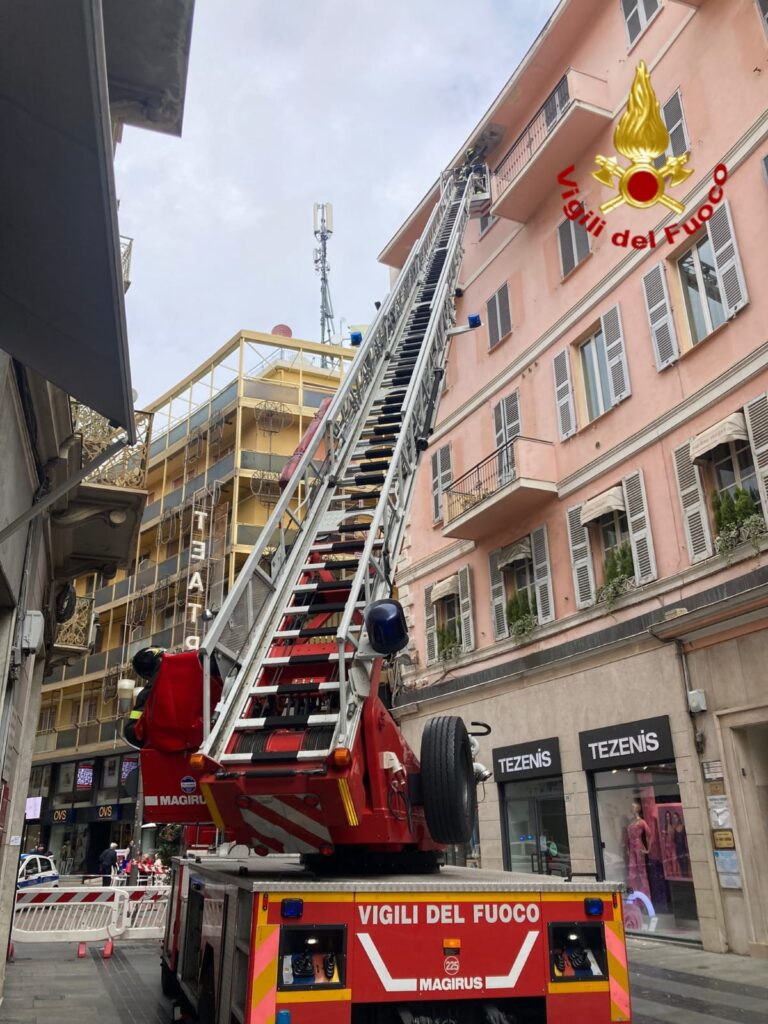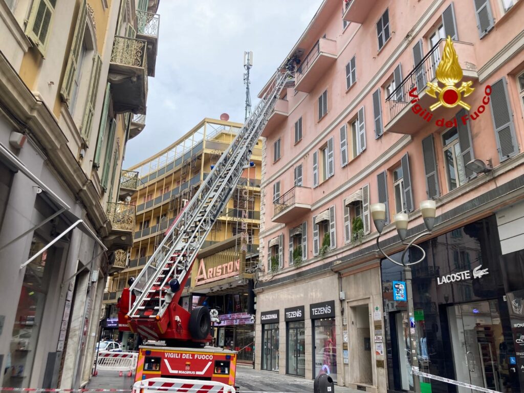 I Vigili del fuoco del Distaccamento di Sanremo sono intervenuti oggi in via Matteotti nella città dei fiori a causa della caduta di calcinacci dal cornicione di un palazzo.