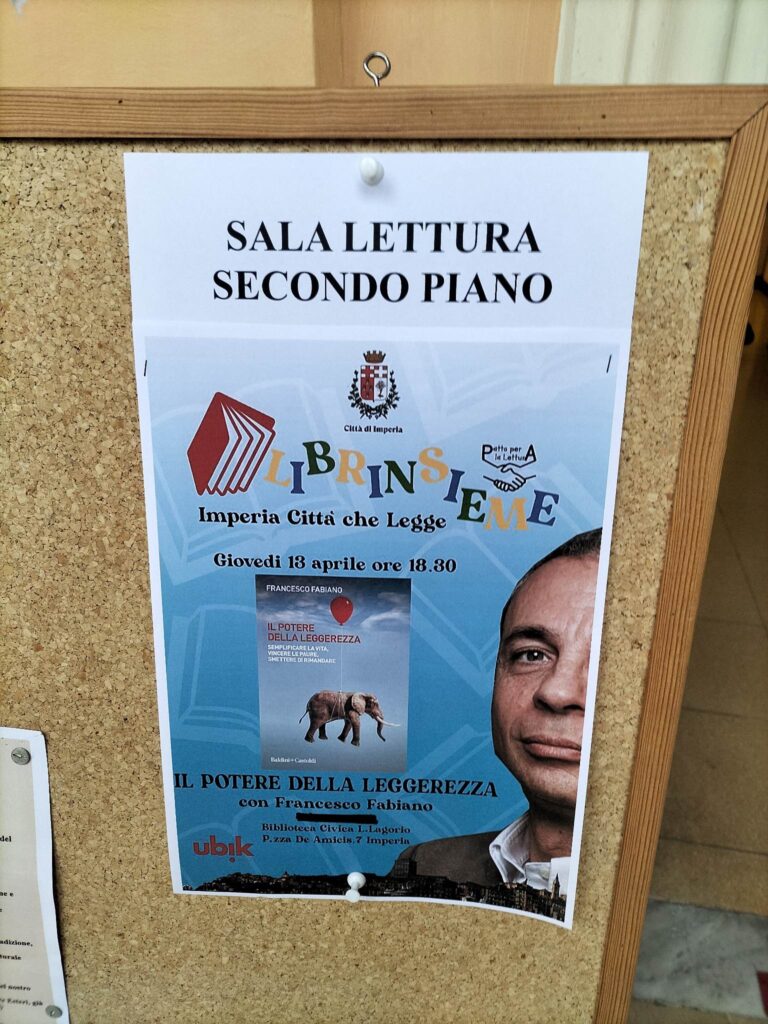 “Il potere della leggerezza” – Si è svolto nel tardo pomeriggio di oggi, 13 aprile, in biblioteca a Imperia, l’incontro con il mental coach Francesco Fabiano.