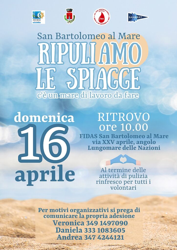 Una giornata dedicata alla salvaguardia dell’ambiente marino, aperta a tutti, con punto di ritrovo previsto alle ore 10:00 presso la sede della Fidas di San Bartolomeo al Mare in via XXV aprile, angolo Lungomare delle Nazioni. Fidas Imperia offrirà un rinfresco a tutti i volontari che parteciperanno all’iniziativa previa segnalazione agli organizzatori. L’evento beneficia del patrocinio del Comune di San Bartolomeo al Mare, che ringrazia le associazioni coinvolte e in modo particolare la Fidas per la sensibilità dimostrata nei confronti del rispetto e della salvaguardia delle spiagge con questa lodevole iniziativa. EGEA fornirà i sacchi che serviranno per la raccolta dei rifiuti e i relativi bidoni che saranno posizionati in piazza Torre Santa Maria.