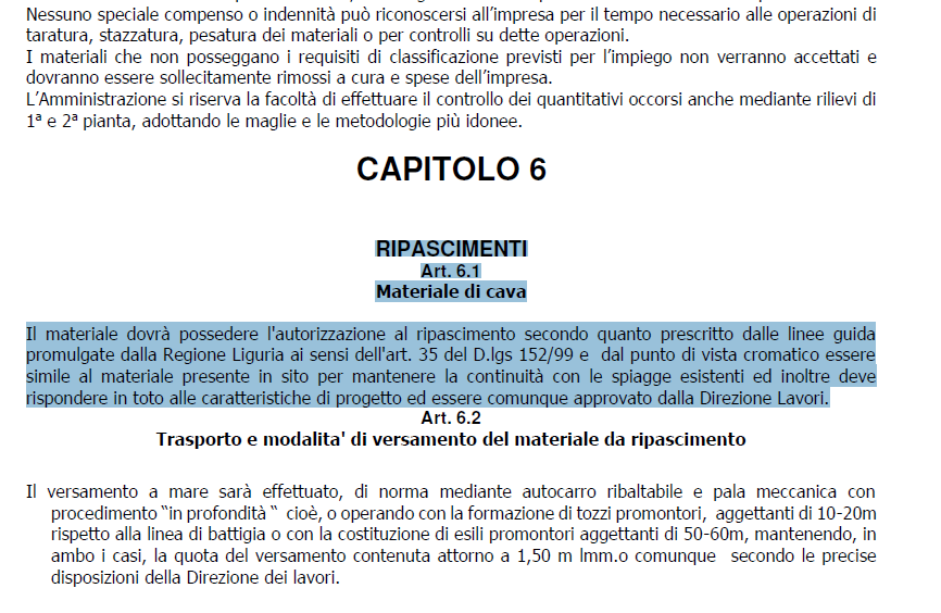 Il nostro giornale ha visionato i documenti relativi al ripascimento delle spiagge di Borgo Prino. Alla luce di quanto indicato nel capitolato di appalto (valore 1.957.000,00 euro + IVA), lascia quantomeno perplessi l’utilizzo, per il ripascimento, di ghiaia di colore grigio scuro. Al Capitolo 6, infatti, alla voce “Ripascimenti – Materiale di Cava” si legge che “il materiale dovrà […] dal punto di vista cromatico essere simile al materiale presente in sito per mantenere la continuità con le spiagge esistenti“. Spiagge esistenti che, sino ad oggi, nell’area di Borgo Prino, hanno sempre avuto la tradizionale sabbia color marrone chiaro. E’ rispettato, dunque, il capitolato? Chiediamo chiarimenti, considerate anche le stringenti prescrizioni sull’uso dei materiali (vedi sotto) al Comune di Imperia, cui lo stesso capitolato demanda l’incarico di verificarne il rispetto, da parte del privato aggiudicatario dell’appalto (l’impresa Cospef), tramite il Rup e la direzione lavori.