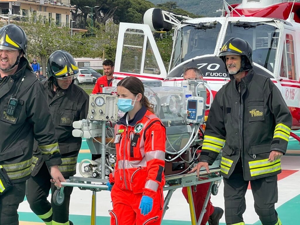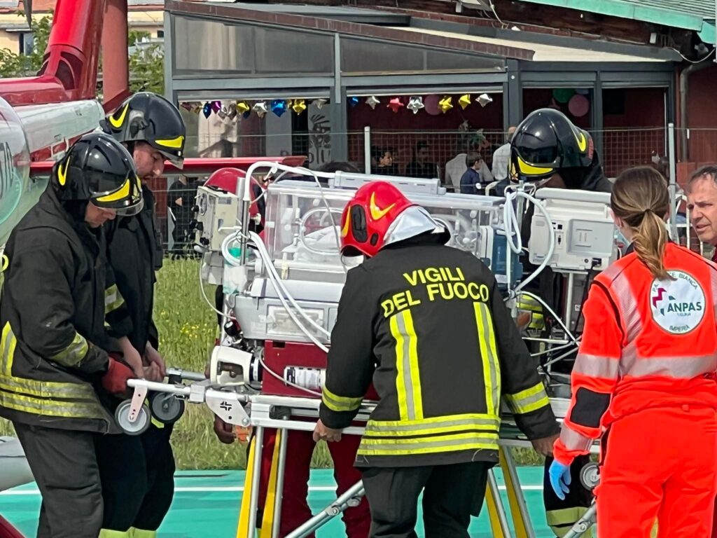 All’eliporto di San Lazzaro è atterrato Drago, l’elicottero dei Vigili dei fuoco, che ha trasferito a Imperia un’equipe medica del Gaslini e una termoculla, sorta di incubatrice trasportabile su barella, volta a mantenere stabili i parametri vitali del neonato.