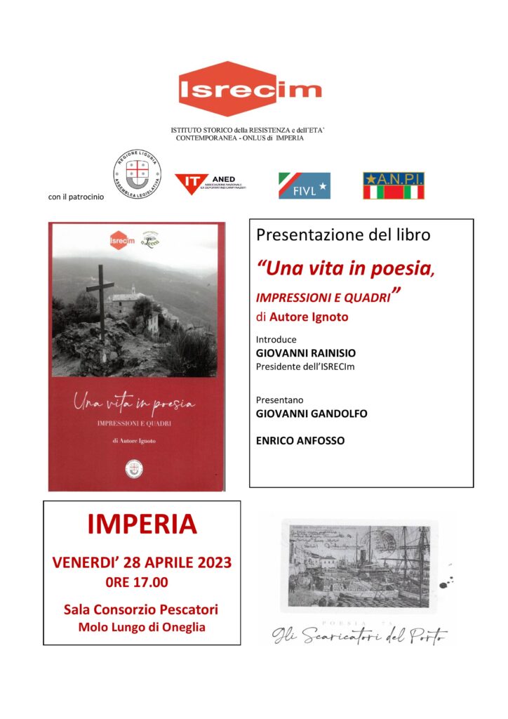 Nell’ambito delle iniziative a corollario del 25 Aprile 2023 Festa della Liberazione, l’Istituto Storico della Resistenza e dell’Età contemporanea di Imperia con il patrocinio dell’Assemblea Legislativa della Regione Liguria, ANED (Associazione ex deportati campi nazisti), ANPI e FIVL , venerdì 28 Aprile alle ore 17 a Imperia presso la Sala Consorzio Pescatori (g.c.) sul Molo Lungo di Oneglia, presenterà il libro: “UNA VITA IN POESIA – Impressioni e quadri” di Autore ignoto.