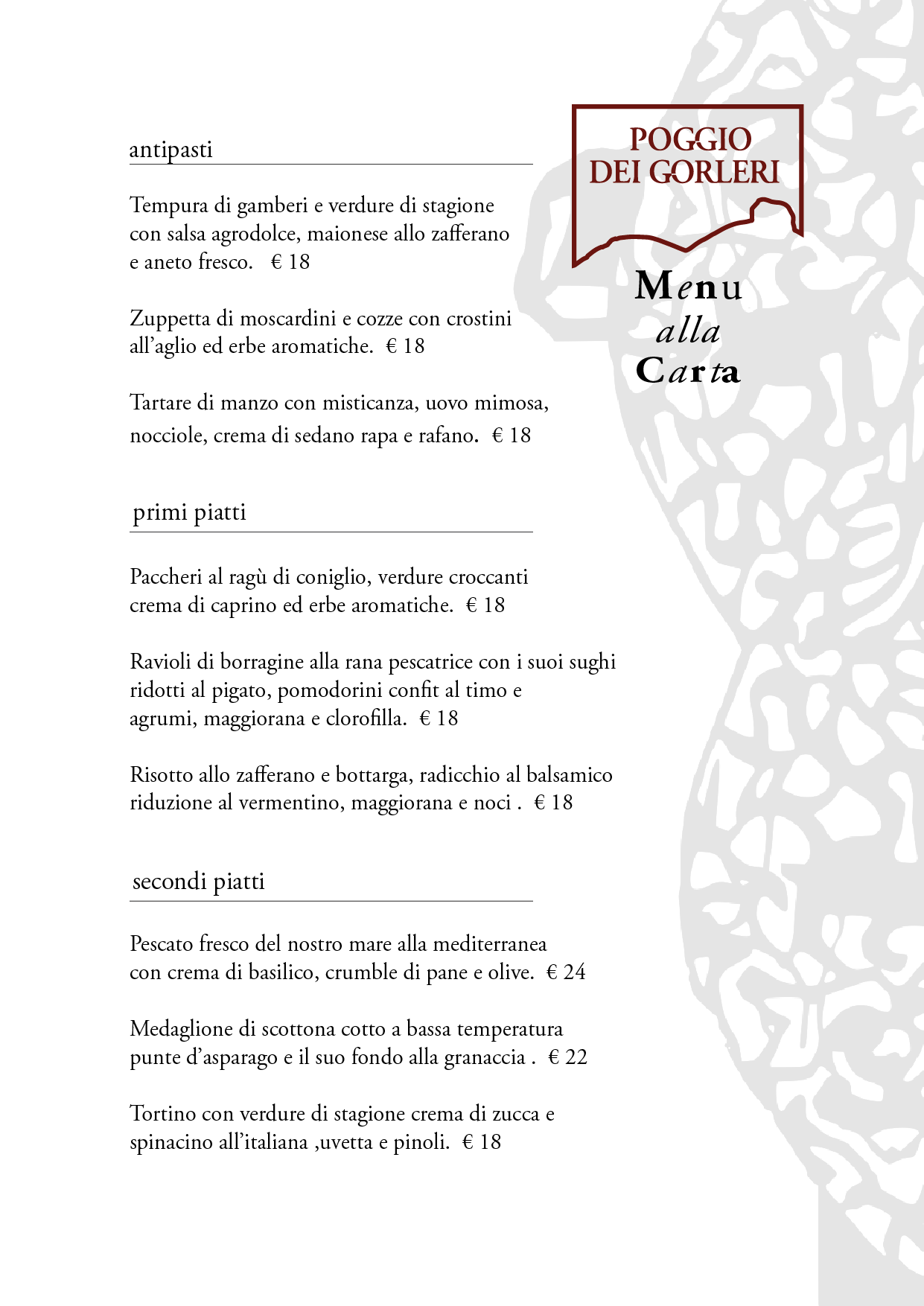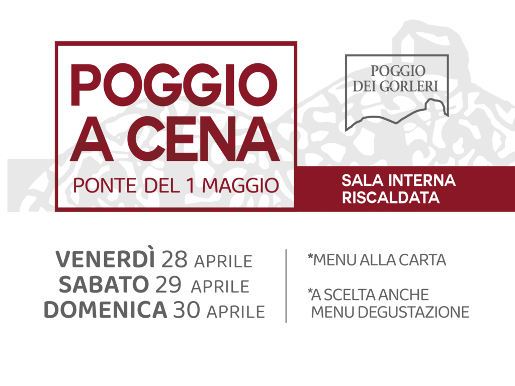 Da venerdì 28 aprile a domenica 30 aprile il team del Poggio dei Gorleri è pronto ad accogliervi a cena nella sala interna riscaldata con le proposte del Menù alla carta oppure con lo sfizioso Menù degustazione.