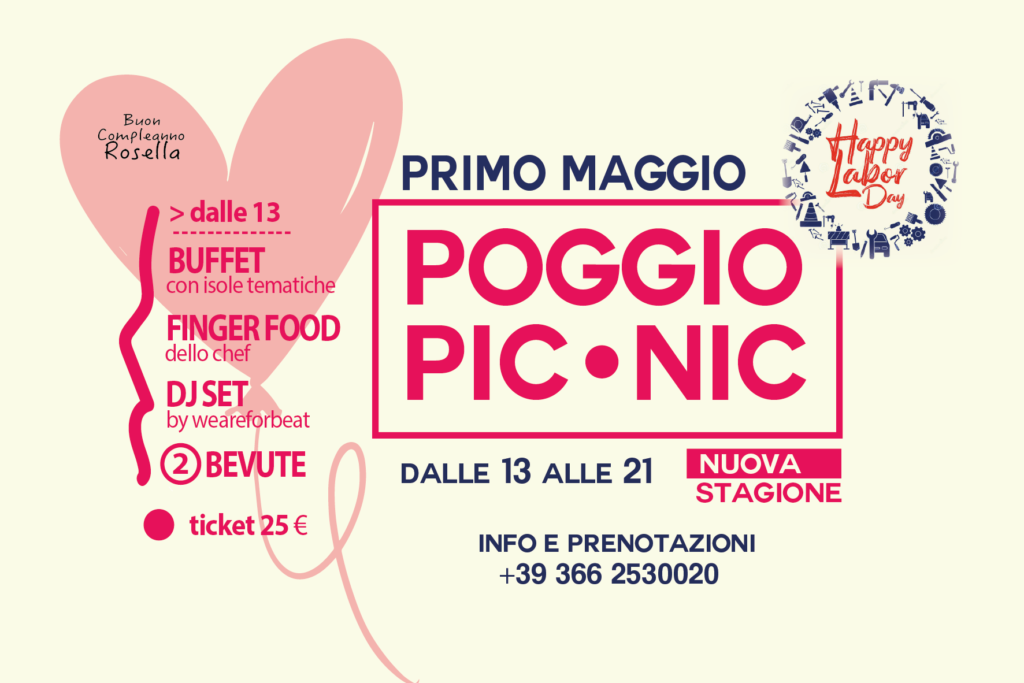 Per una giornata indimenticabile, non perdetevi il pic nic del Primo maggio, dalle 13 alle 21, con finger food a cura dello chef, buffet a isole tematiche e il dj set di We Are For Beat. Vi sorprenderà un duo acustico, voce e chitarra, che renderà la giornata ancora più magica.