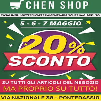Chen Shop in via Nazionale 38 a Pontedassio offre una grande occasione a tutti i clienti: il 5, 6 e 7 maggio sconto eccezionale del 20% su tutti i prodotti.