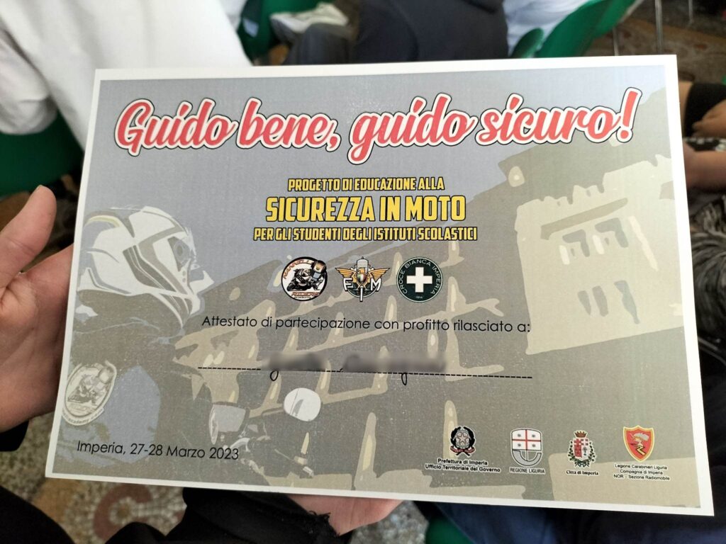 Questa mattina la premiazione, alla presenza degli istruttori Federali Motociclismo, l’assessore regionale Marco Scajola, il Dirigente Scolastico Angelo Quaglia, l’assessore del Comune di Imperia Simone Vassallo e il presidente della Croce Bianca Roberto Trincheri.
