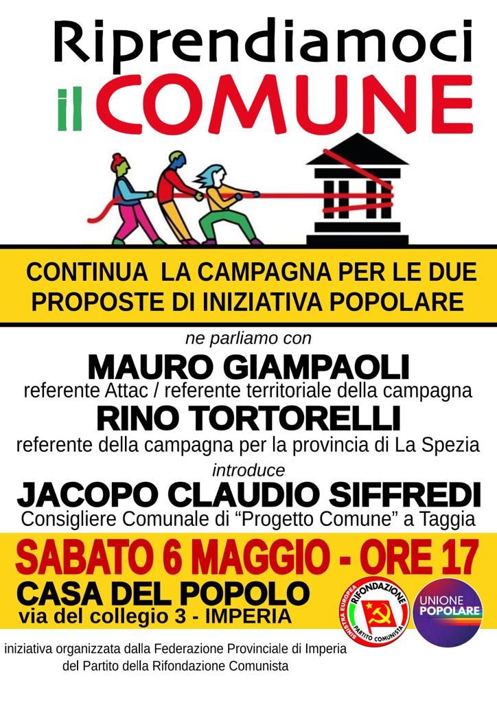 Rifondazione Comunista ha ospitato oggi nella sede di Imperia, via del Collegio 3 ad Oneglia, Mauro Giampaoli e Rino Tortorelli del Comitato Promotore della Campagna Riprendiamoci il Comune e Jacopo Siffredi, consigliere comunale di Taggia.