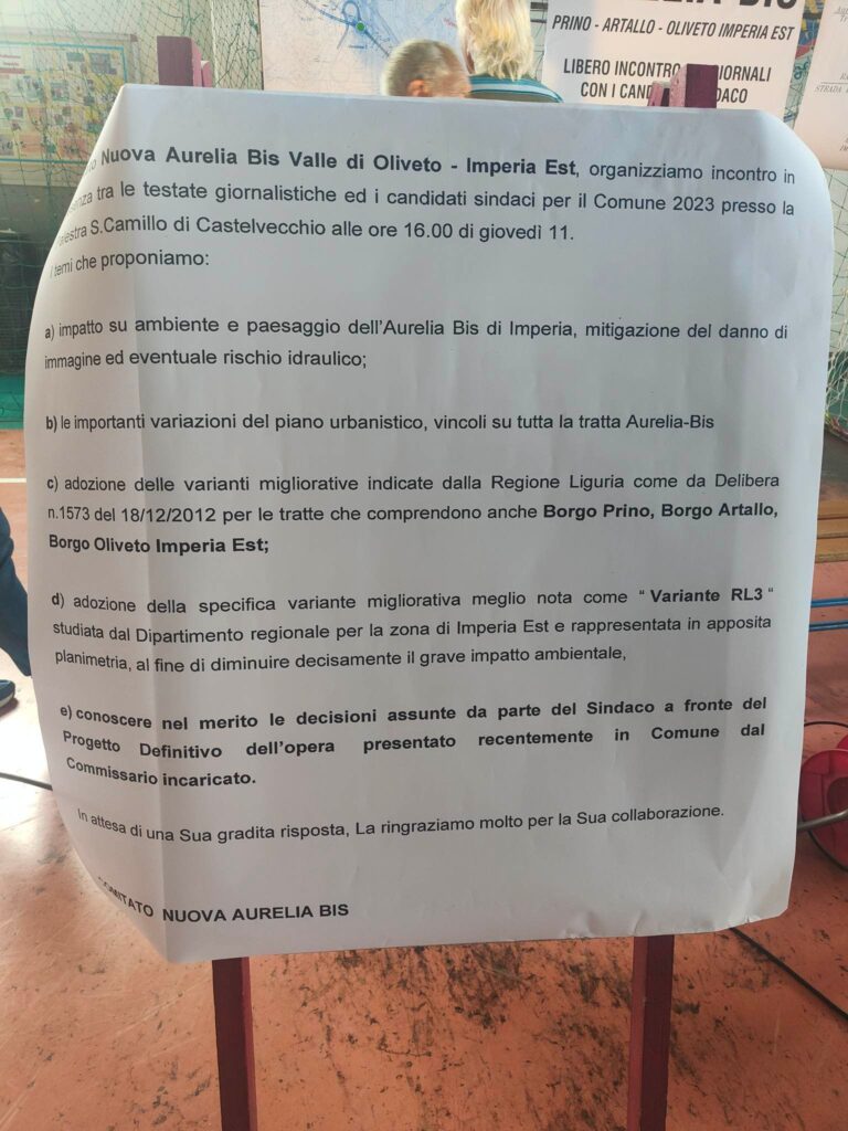 “Chiediamo che la cittadinanza venga infornata dello stato dell’arte del progetto dell’Aurelia Bis”. Questo l’appello dei quattro candidati sindaco, che si unisce a quello degli abitanti delle zone interessate dal progetto, rivolto all’amministrazione comunale uscente, guidata dal Sindaco Claudio Scajola, che però non si è presentato all’incontro presso la Palestra S.Camillo di Castelvecchio, organizzato dal Comitato Nuova Aurelia Bis Valle di Oliveto – Imperia Est.