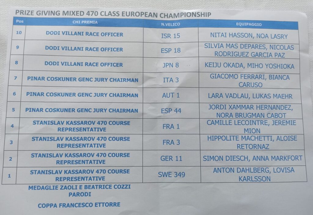 Si sono conclusi con la premiazione di ieri pomeriggio, i Campionati europei di vela classe 470, i cui vincitori saranno presenti alle prossime olimpiadi.