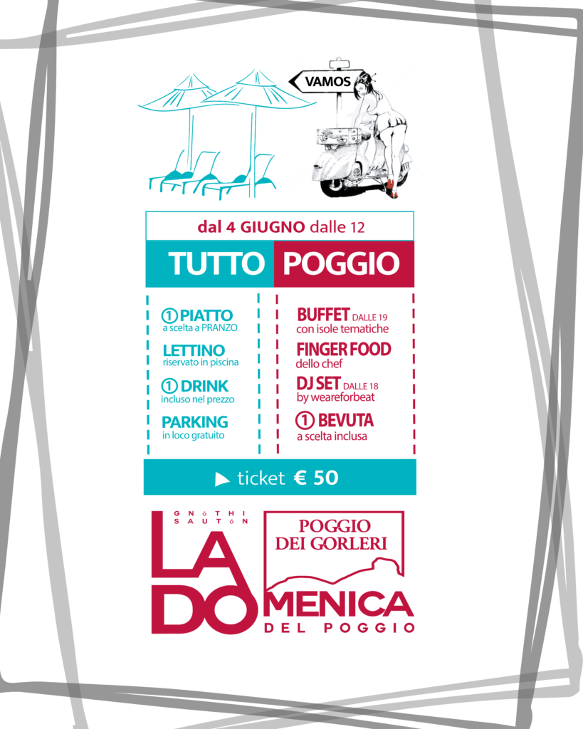 Dal 4 giugno, tutte le domeniche, riparte la DOMENICA DEL POGGIO. A dare il benvenuto, dalle 18, c’è il dj set by “Weareforbeat”. Lasciati tentare dalle delizie del buffet a isole tematiche: fritti, salumi, formaggi e finger food dello chef, da gustare con i vini del Poggio e drink.