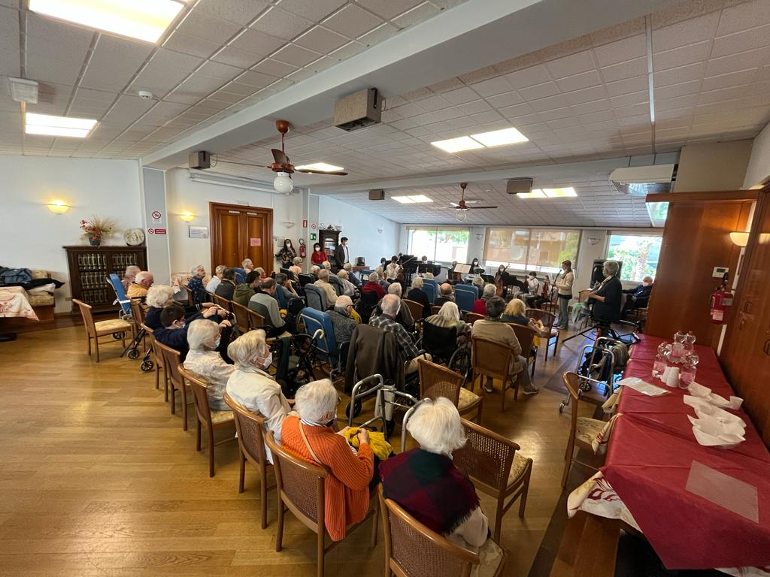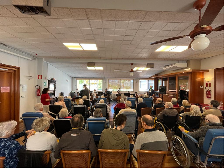 La musica e più in generale i suoni, hanno lo straordinario potere di produrre reazioni emotive: gli anziani hanno partecipato attivamente al concerto tramite il movimento di foulard colorati, trasformandosi in pittori che dipingono le note musicali.
