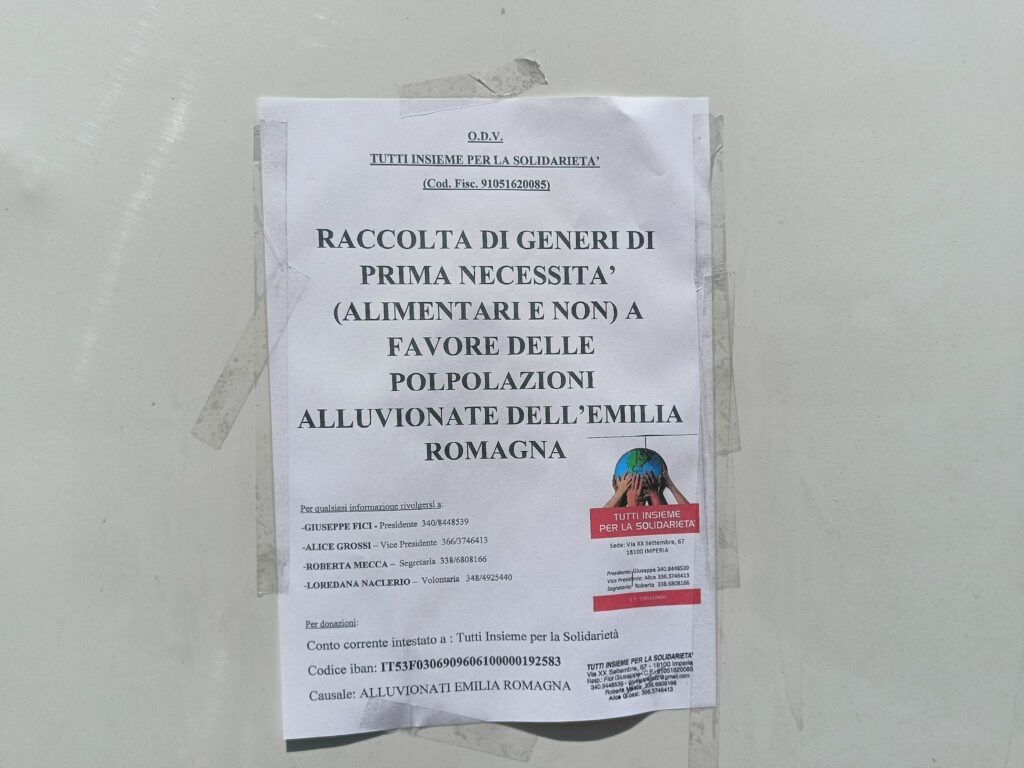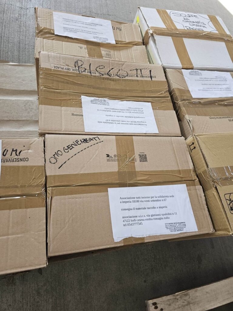Il Presidente dell’associazione “Tutti insieme per la solidarietà”, Giuseppe Fici, ha consegnato oggi, 27 maggio, all’associazione A.I.C.S. di Forlì-Cesena, i beni di prima necessità raccolti a Imperia, con la preziosa collaborazione di Alice Grossi e Sabrina Ramella, per far fronte all’emergenza che sta colpendo l’Emilia Romagna a causa degli ultimi fenomeni alluvionali.